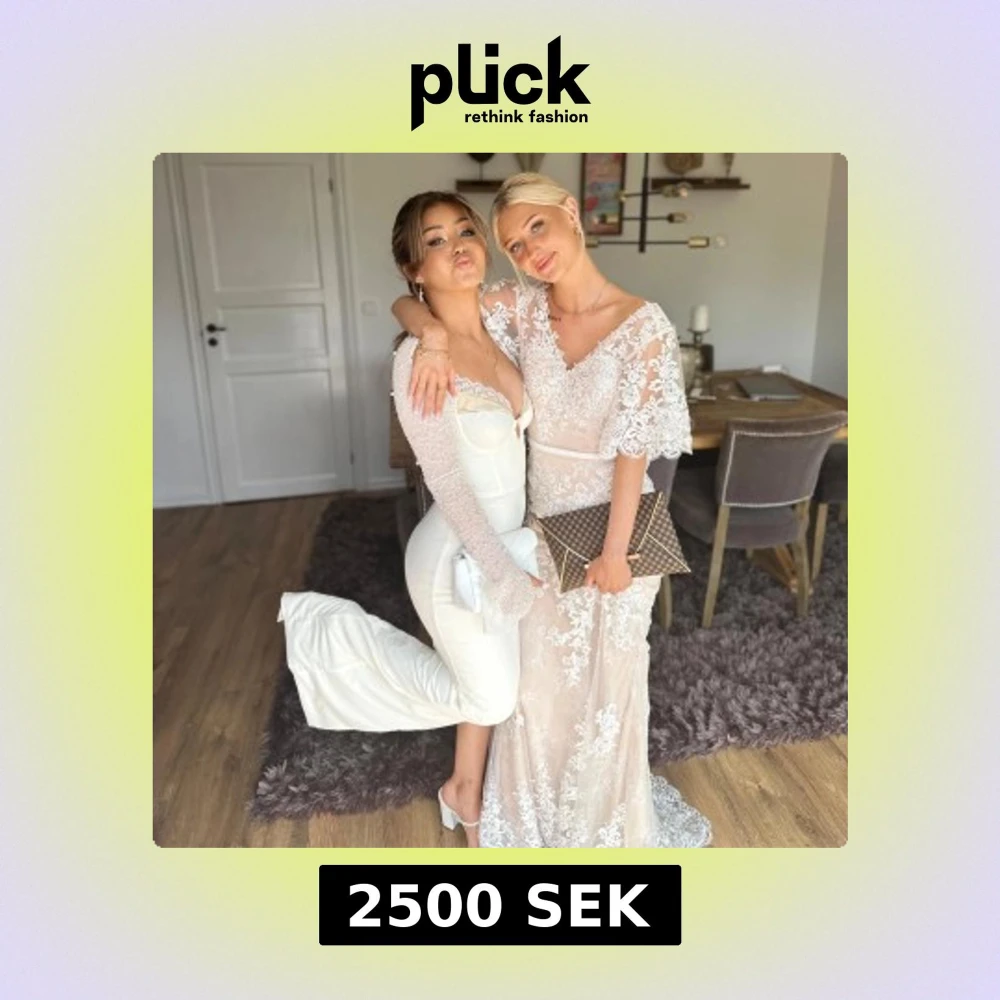 Romantisk långklänning i vit spets med v-ringad hals och volangdetaljer. Klänningen har korta ärmar och markerad midja med knytband. Perfekt för speciella tillfällen.
