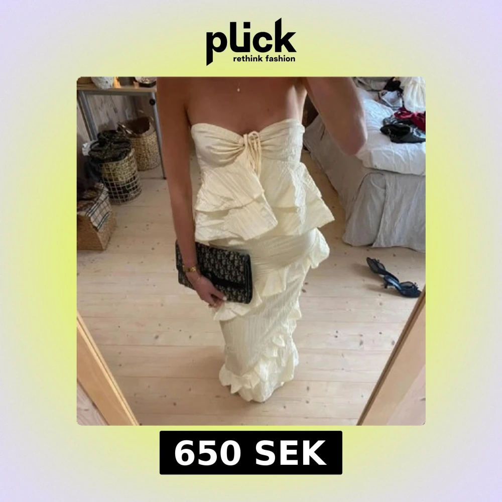 Superfin axelbandslös långklänning i champagnefärg med volangdetaljer och knyt framtill. Klänningen har en figurnära passform och är perfekt för festliga tillfällen. (Lånade bilder) den var för liten för mig