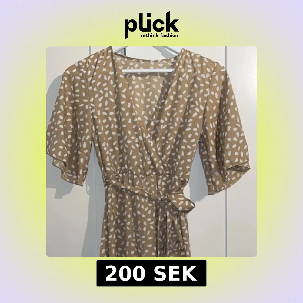 Superfin beige omlottklänning med vita prickar och knyt i midjan. Klänningen har v-ringning, korta vida ärmar och ett luftigt fall. Perfekt för varma dagar och ger en avslappnad men ändå trendig look.
