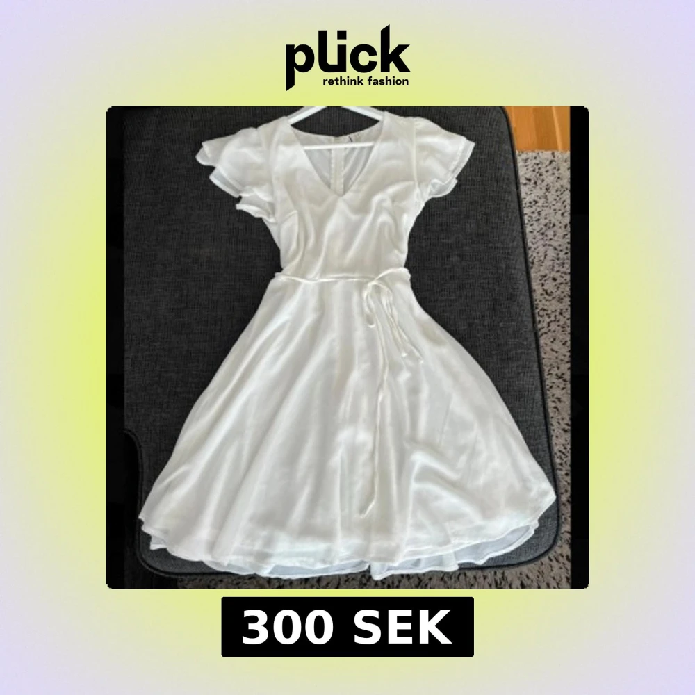 Säljer en superfin vit omlottklänning med korta volangärmar och v-ringning. Klänningen har ett tunt knytband i midjan och är tillverkad i ett lätt, glansigt material som ger ett elegant fall. Perfekt för studenten eller sommaren. Använd 1 gång.