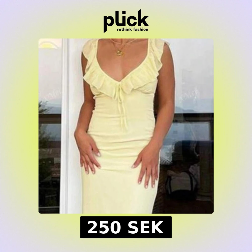 Supersöt långklänning i ljusgul nyans med volangdetaljer vid urringningen och knyt framtill. Klänningen har smala axelband, öppen rygg med knyt och figurnära passform. Perfekt för sommarens alla tillfällen!