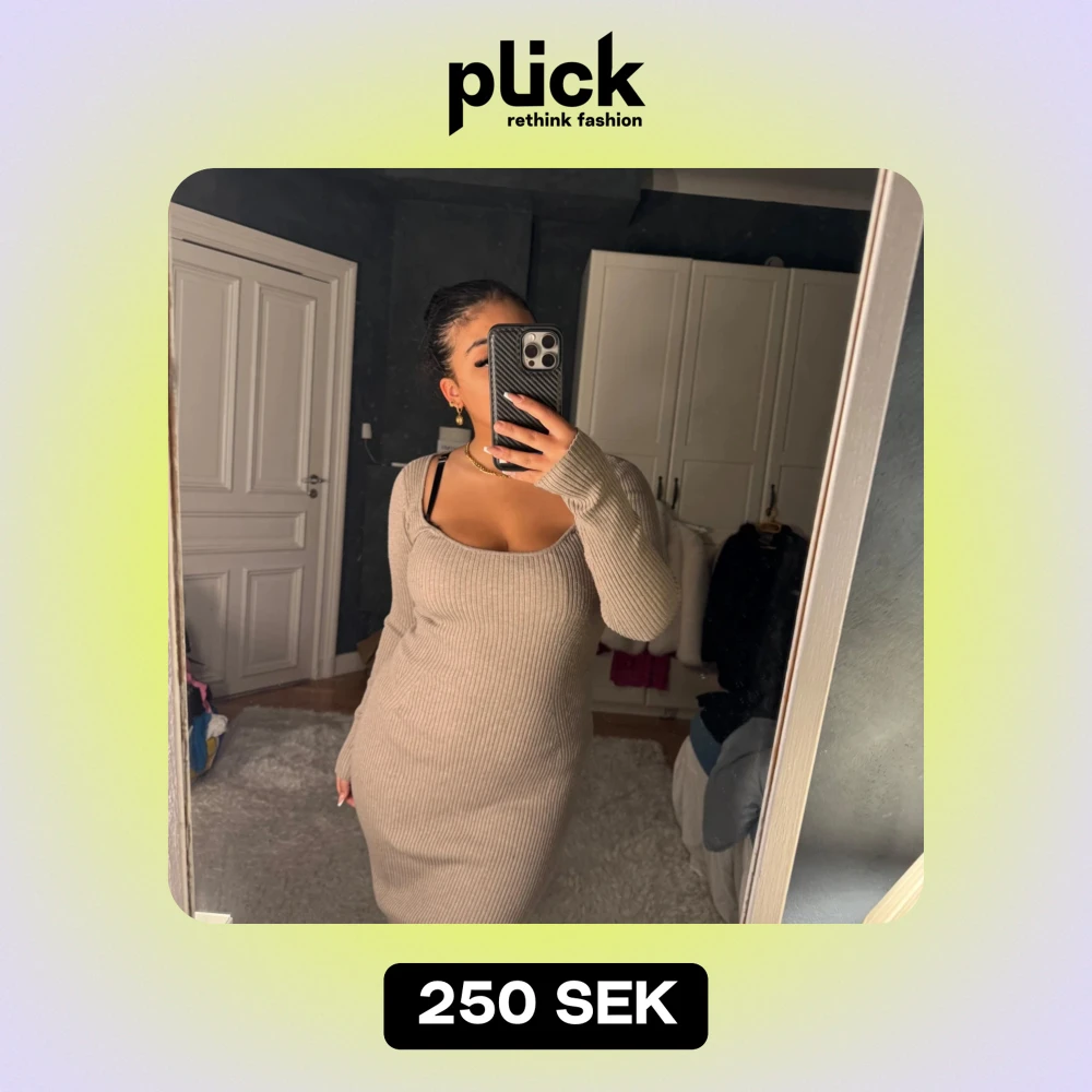 Säljer en superfin beige ribbad klänning i stickat material. Den är långärmad och har en tight passform. Passar S/M