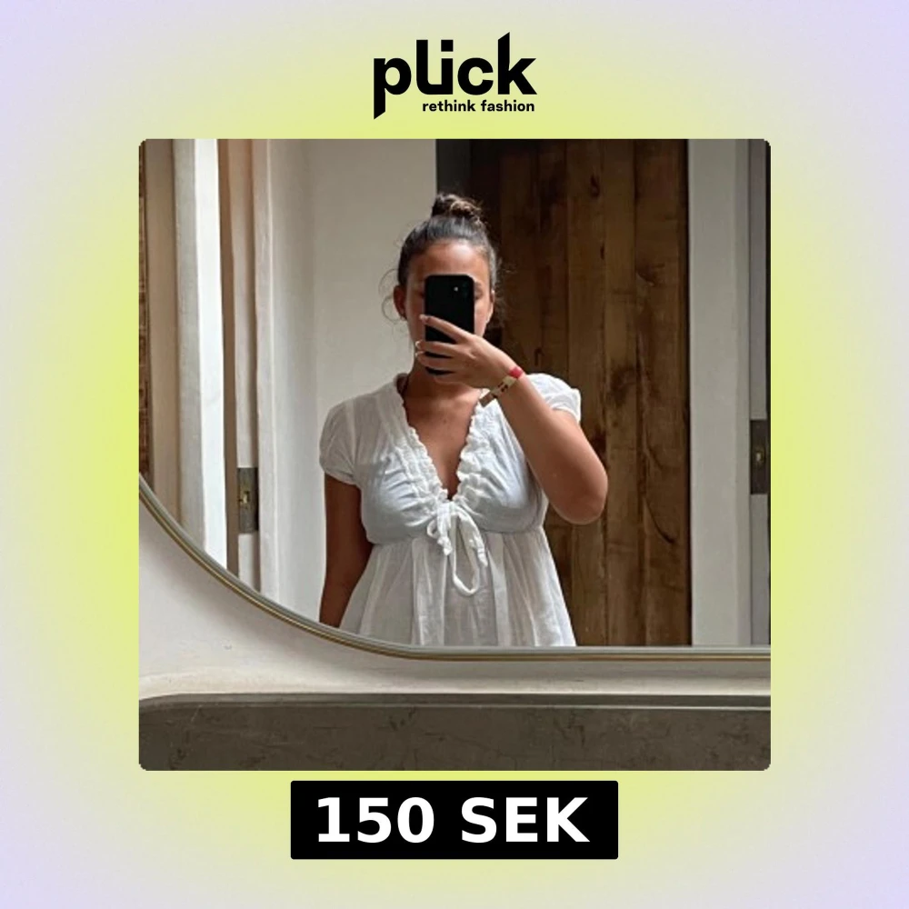 Charmig vit klänning med knytning framtill och korta ärmar. Perfekt för en avslappnad sommarlook. Den har en v-ringad design och är tillverkad i ett lätt material.