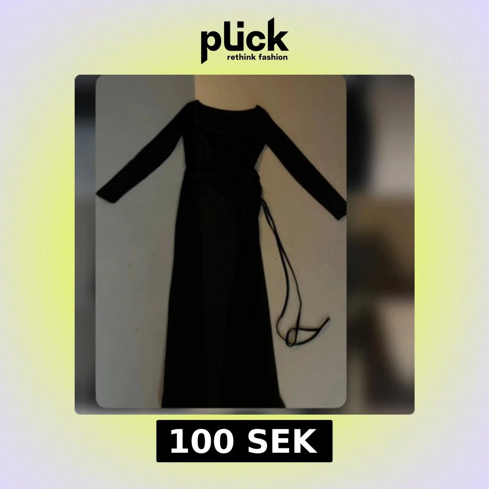 Svart långklänning med långa ärmar och knytband i midjan med hög slits. Fyrkantig urringning. Aldrig använd endast testad
