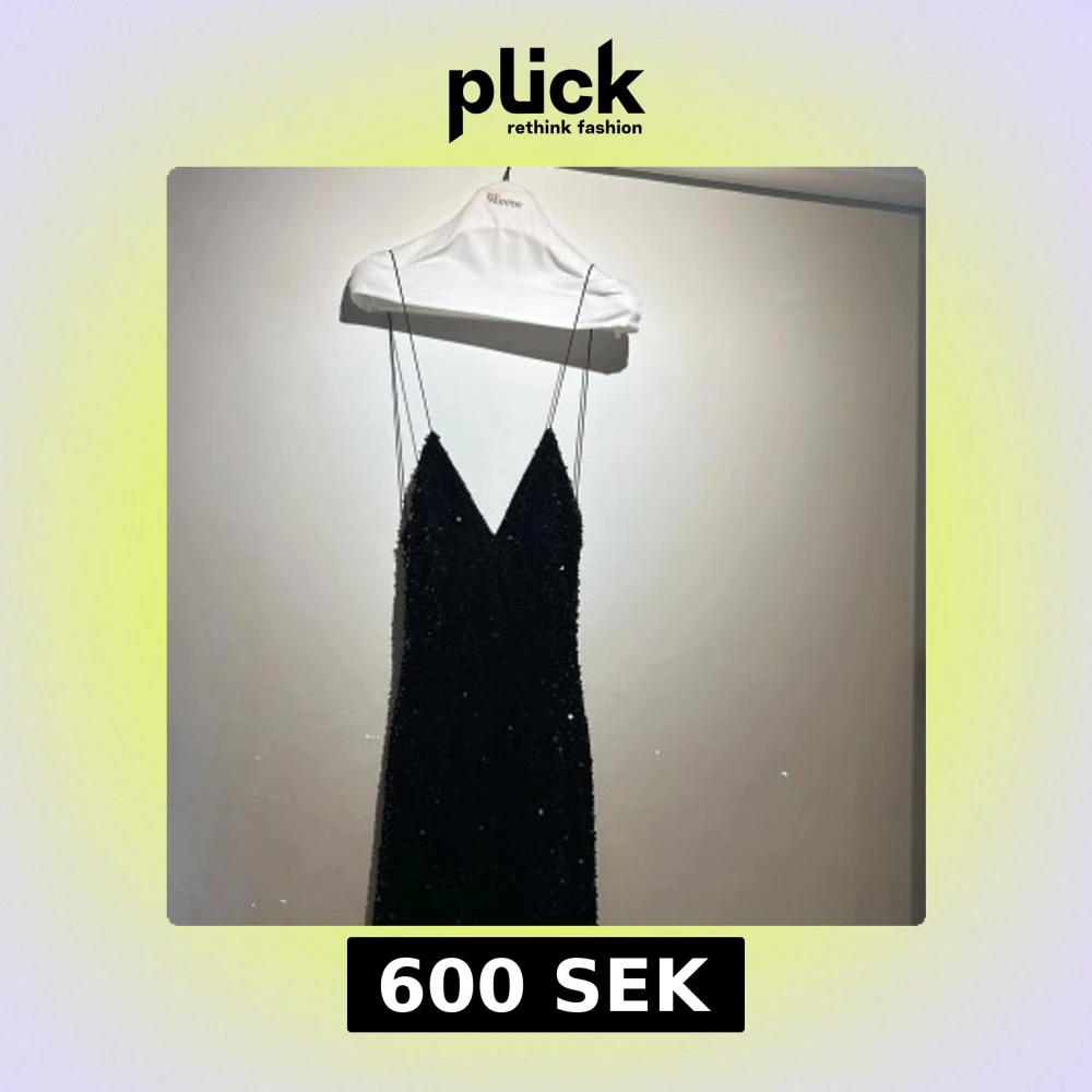 Supersnygg svart långklänning med tunna axelband, djup v-ringning och öppen rygg. Klänningen är täckt av glittriga paljetter och har en elegant, figurnära passform. Perfekt för dig som vill sticka ut och glänsa. Den är super bekväm och stretchig använd 1 kväll