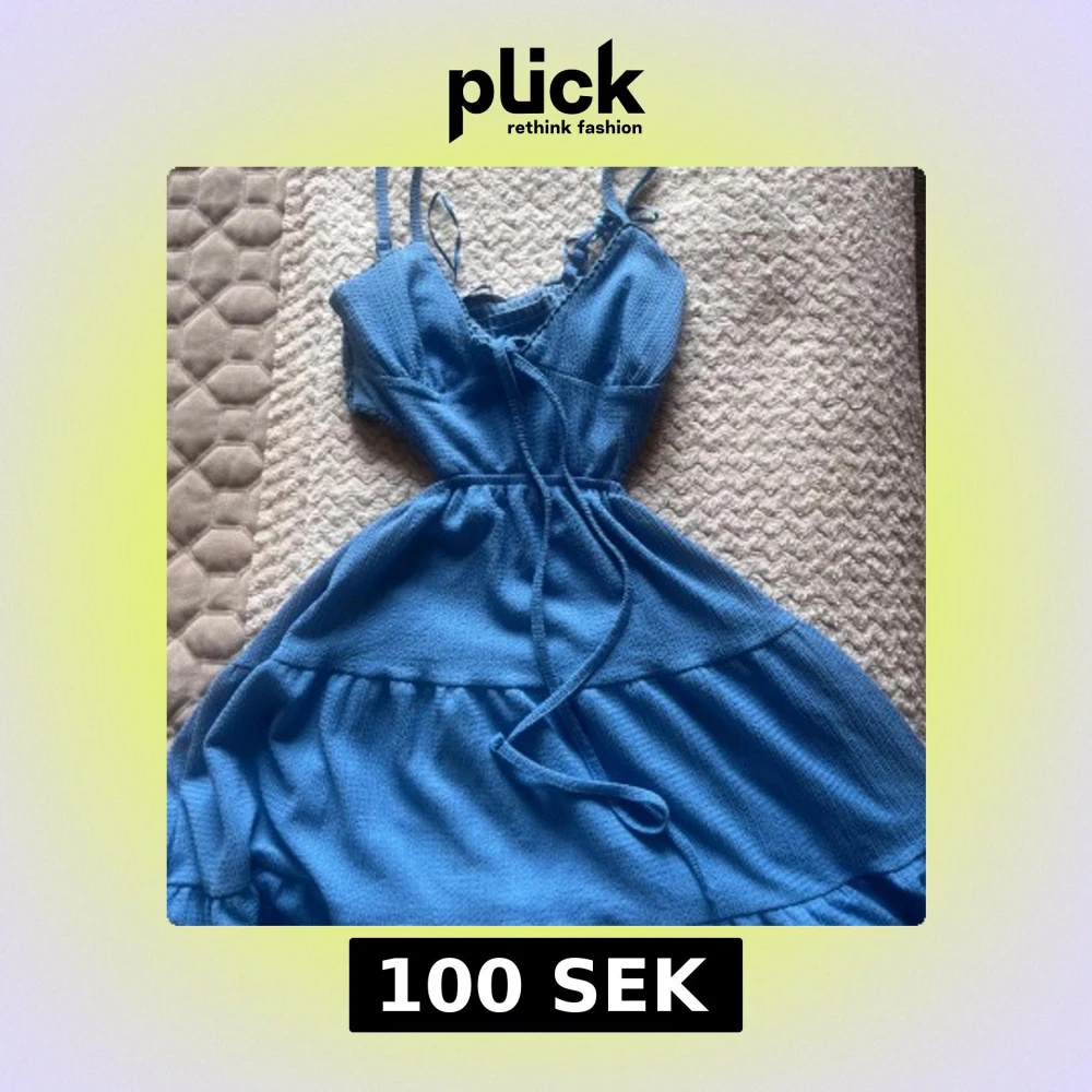 Supersöt blå kortklänning med smala axelband, v-ringning och markerad midja. Den är öppen i ryggen och på sidorna.