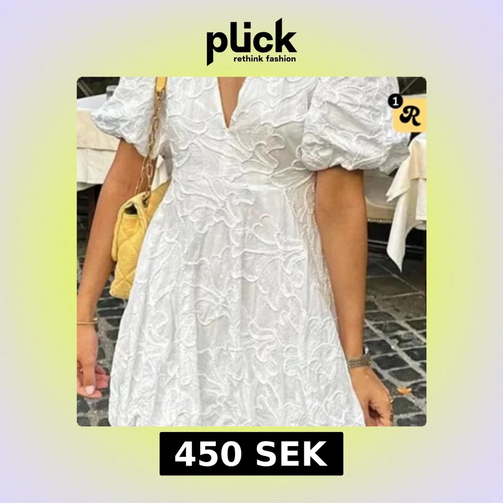 Superfin vit kortklänning med broderade blommönster och puffiga korta ärmar. Klänningen har v-ringning och markerad midja som ger en snygg siluett. Perfekt för sommarens alla tillfällen och ger en romantisk vibe.