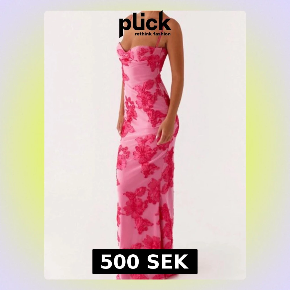 Supersnygg rosa långklänning med tunna axelband och broderade röda blommor. Klänningen har en figurnära passform och en draperad urringning. Perfekt för bal eller festligare tillfällen. Klänningen är aldrig använd och i topp skick!