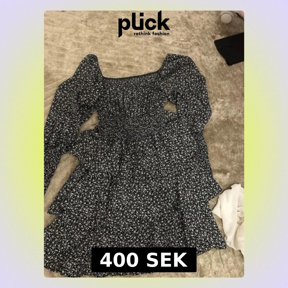 Supersöt svart kortklänning med vita små blommor och långa puffärmar. Klänningen har smockad överdel och volangdetaljer i kjolen, vilket ger en romantisk vibe.