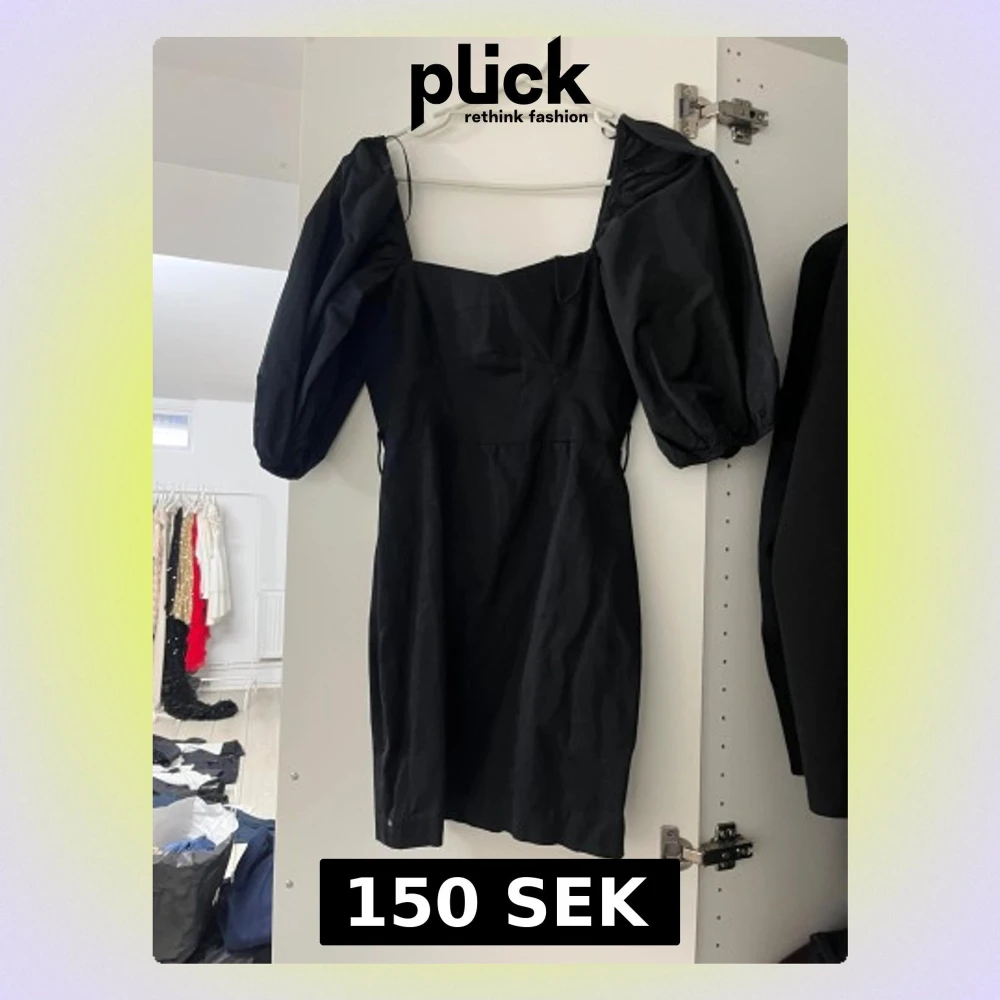 Snygg svart klänning med puffiga korta ärmar och fyrkantig halsringning. Modellen är kort och har en figurnära passform som ger en trendig siluett. Perfekt för dig som gillar statement-ärmar och stilren design. Materialet känns lätt och har en matt finish.
