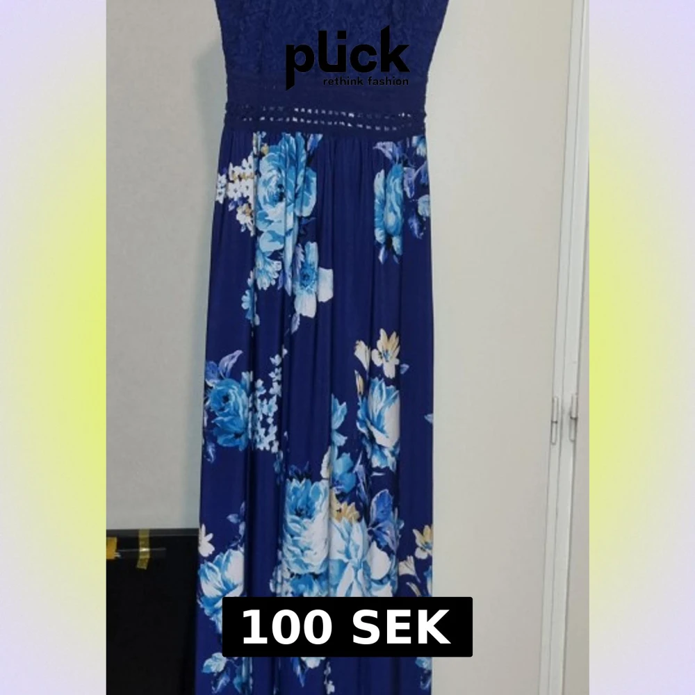 Snygg marinblå långklänning med spets upptill och vackert blommigt mönster i blått och vitt på kjolen. Klänningen har ärmlös design och markerad midja med dekorativt band. Perfekt för dig som vill sticka ut med en elegant och romantisk look.