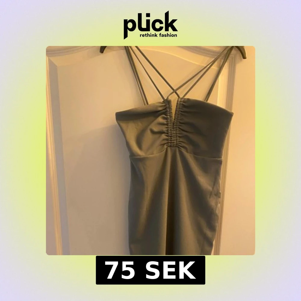 Snygg grå klänning med smala korsade axelband och rynkdetalj framtill. Axelbandslös design som ger en stilren och modern look. Perfekt för dig som gillar minimalistisk stil och vill sticka ut med enkla detaljer. Har enbart använts en gång.