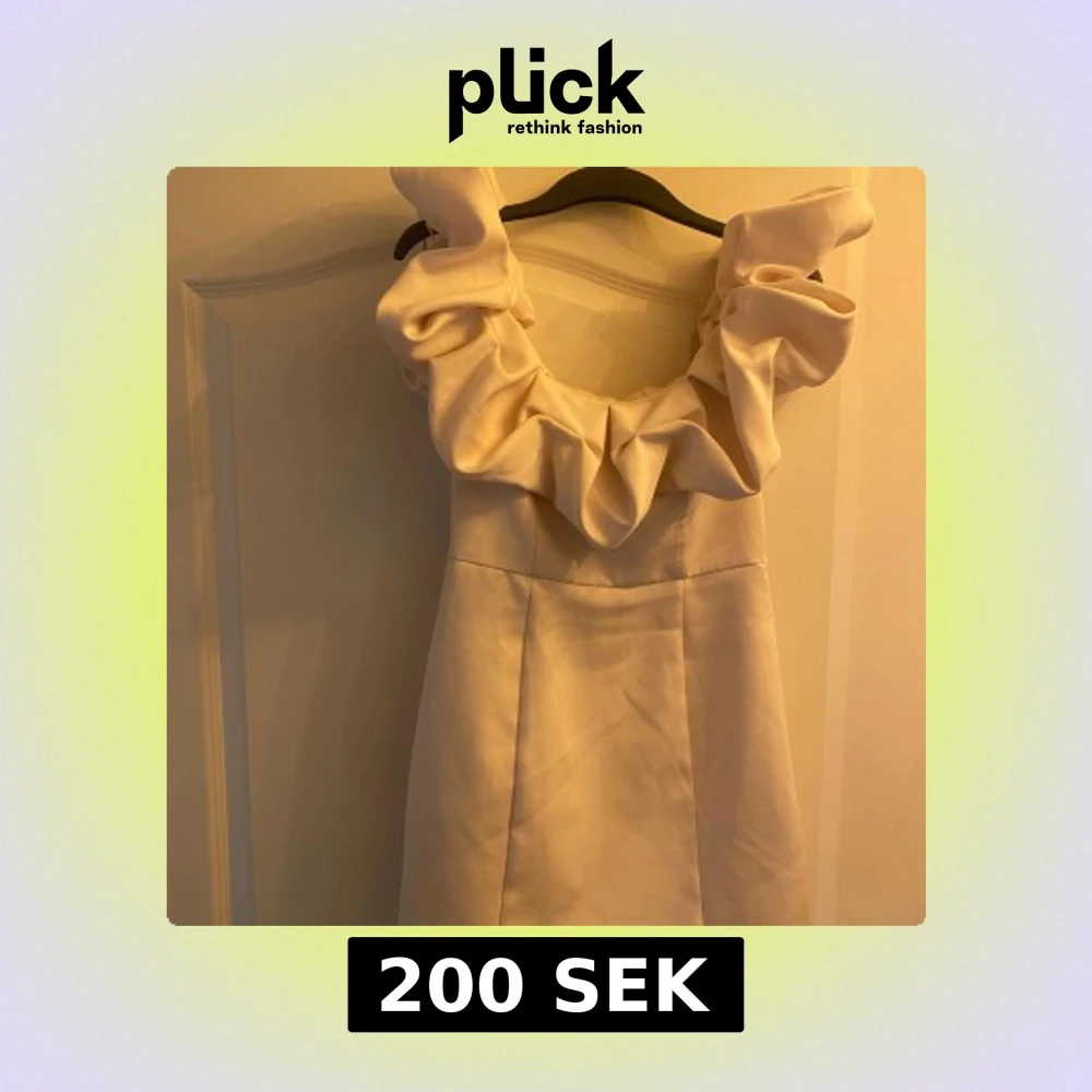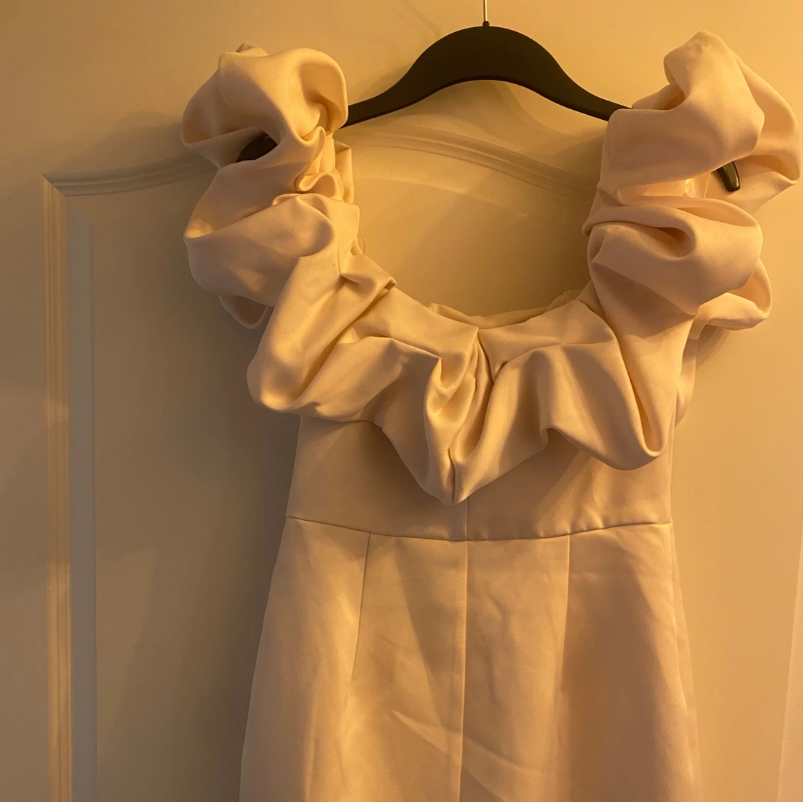 Superfin kort klänning i champagnefärg med stora volangdetaljer runt axlarna. Klänningen har en elegant och modern look med en figurnära passform och är tillverkad i ett glansigt material som ger en lyxig känsla. Perfekt för dig som vill sticka ut. Funkar perfekt till studentfirande, troförlovning, förlovning, bröllop och andra festliga tillfällen.