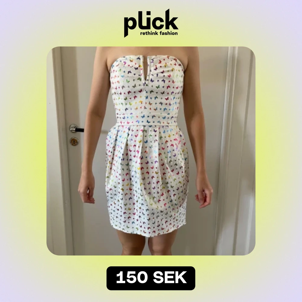 Säljer en vacker vit axelbandslös cocktailklänning från Goddess London. Den har ett färgglatt fjärilsmönster. Inga hål eller fläckar. Storlek saknas, uppskattas till S/36
