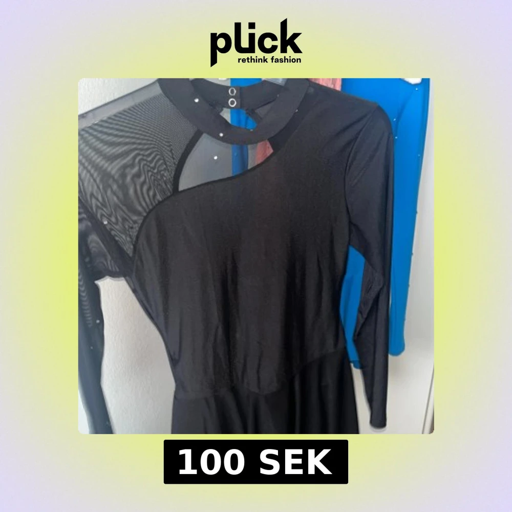 Säljer en svart långärmad klänning med meshdetaljer och öppen rygg. Klänningen har en cool asymmetrisk design med transparent mesh på ena axeln och små glittriga detaljer. Perfekt för dig som vill sticka ut med en edgy look ute på isen