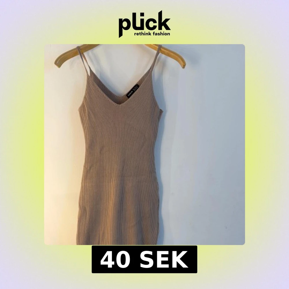 Figursydd klänning med smala axelband och V-ringning. Klänningen har en ribbad struktur. Storlek S. Smått nopprig, se bild.