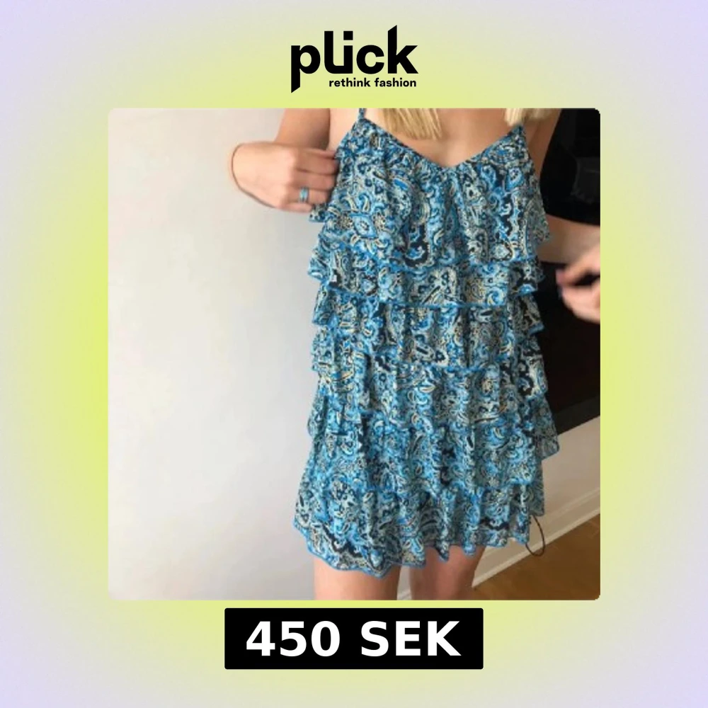 Supersöt kort blå klänning med tunna axelband och flera lager volanger. Klänningen har ett paisleymönster i blått, svart och beige, samt öppen rygg. Perfekt för sommarens varma dagar och ger en riktigt fräsch vibe. står ej storlek men skulle gissa s/m! pris kan diskuteras