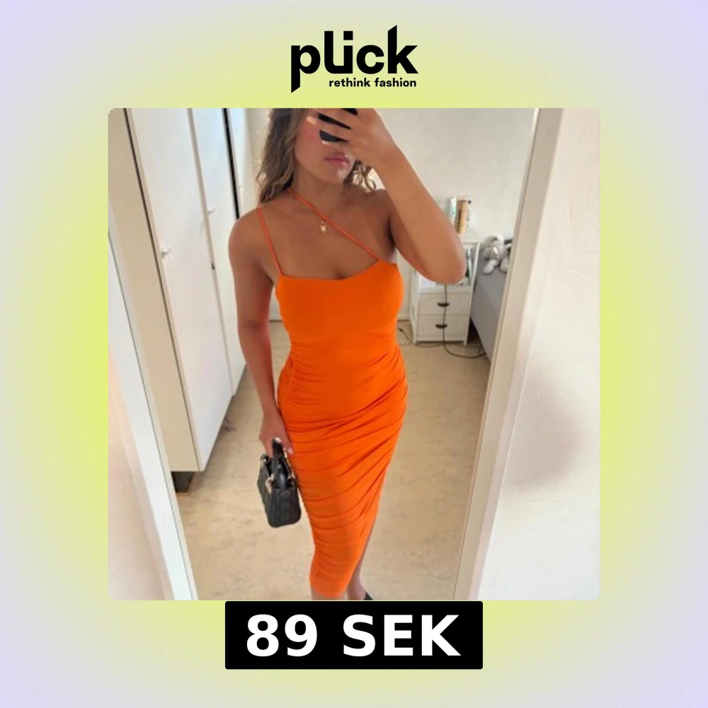 Säljer en superfin orange långklänning med smala axelband, varav ett går diagonalt över bröstet för en unik look. Klänningen är tight och figurnära med snygg rynkning längs sidorna. Perfekt för dig som vill sticka ut med färg och stil i sommar!