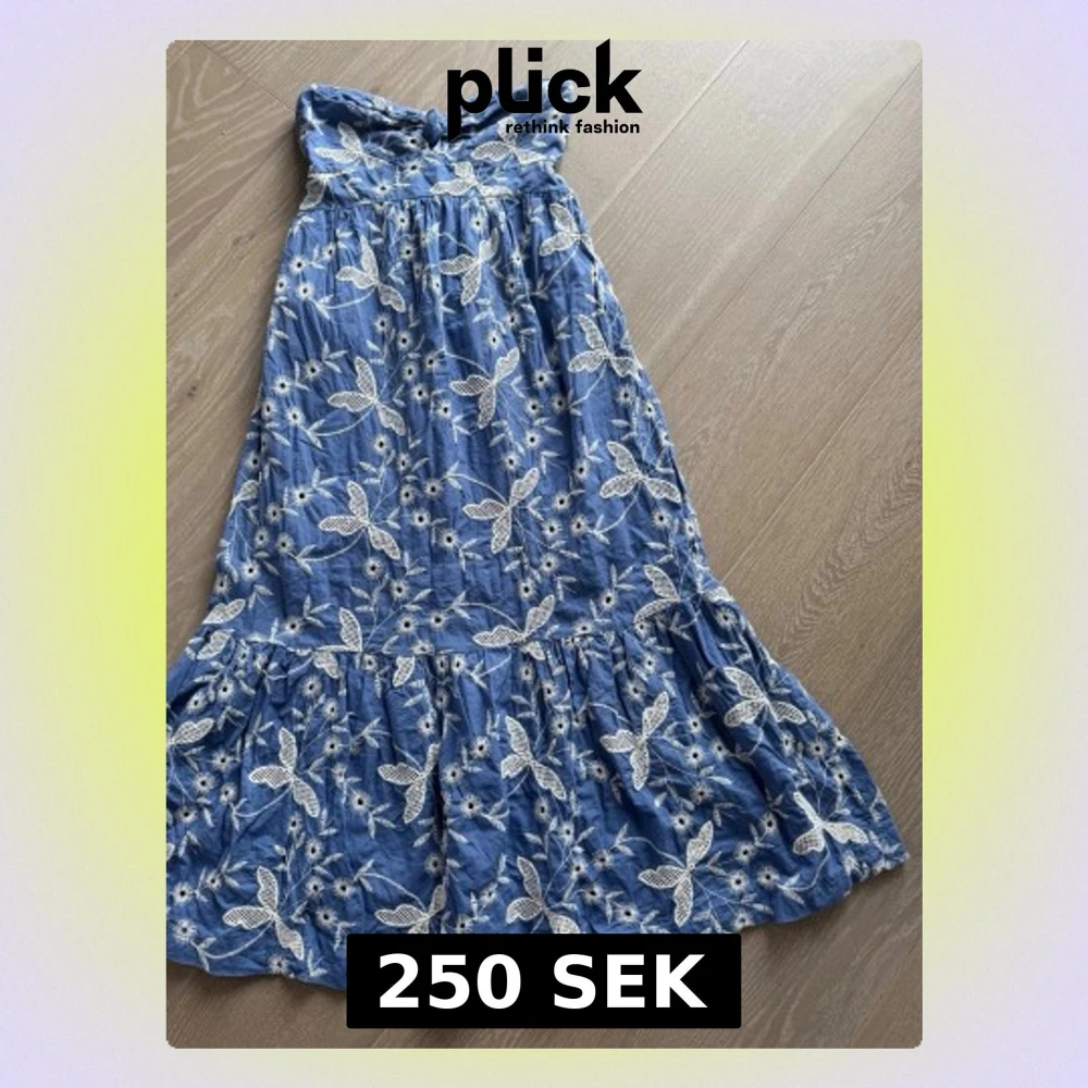 En blå axelbandslös långklänning med vita broderade blommor. Klänningen har en volang nertill. Superfint skick