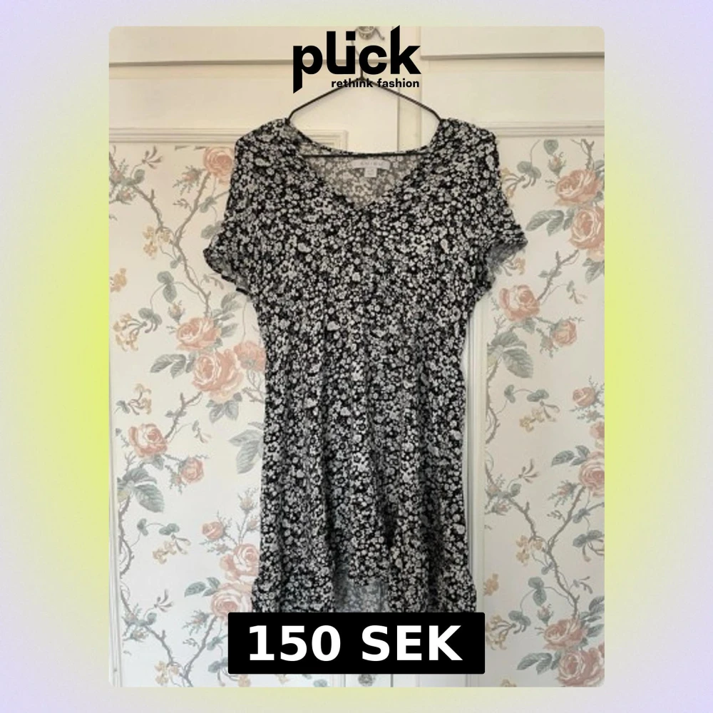 Supersöt svart kortklänning med vitt blommönster och volangkant. Klänningen har v-ringning och korta ärmar, vilket ger en luftig och somrig känsla. Perfekt för dig som gillar en feminin och avslappnad stil. Skriv vid funderingar 🩷