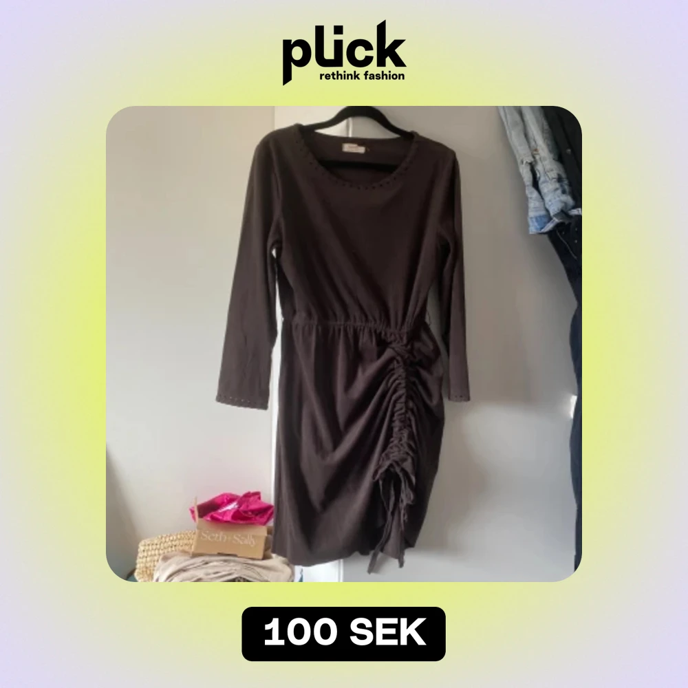 Snygg mocca klänning i mörkbrun färg, strl 36 , har sytt in en ruffel effekt på vänster kjol sida (se bild) som man kan justera beroende på hur mycket ruffel du vill ha men om man ej vill ha den så kan man dra bort lädersnöret