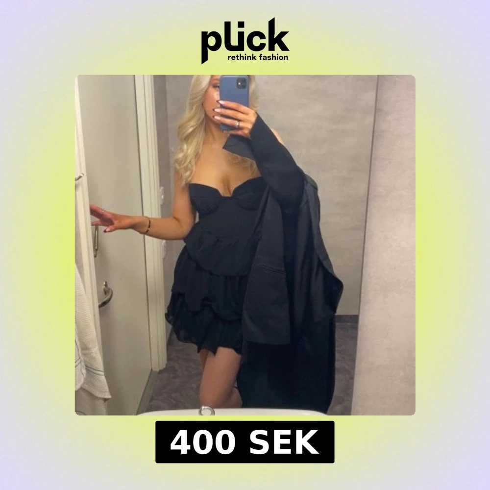 Supersnygg svart kort klänning med hjärtformad urringning och volangkjol. Axelbandslös modell som ger en elegant och trendig look. Perfekt för dig som vill sticka ut och känna dig extra fin.