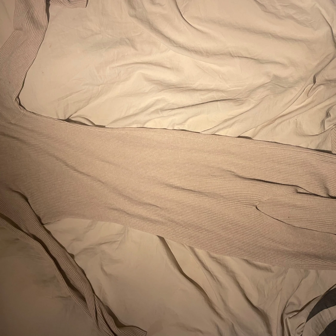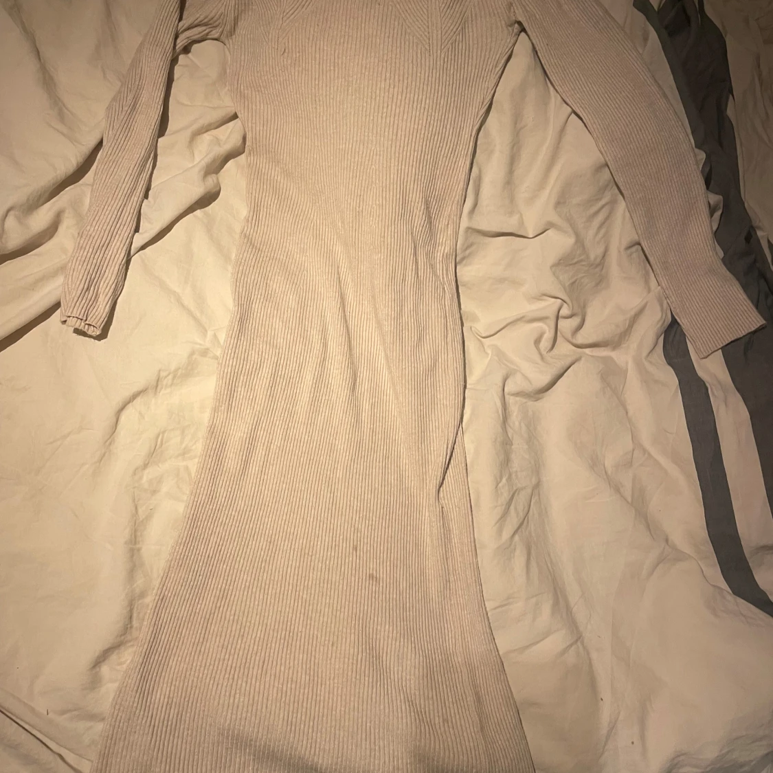 Säljer en stilren beige ribbad långklänning med långa ärmar. Perfekt för en elegant och avslappnad look. Klänningen har en smickrande passform och är gjord i ett mjukt material.