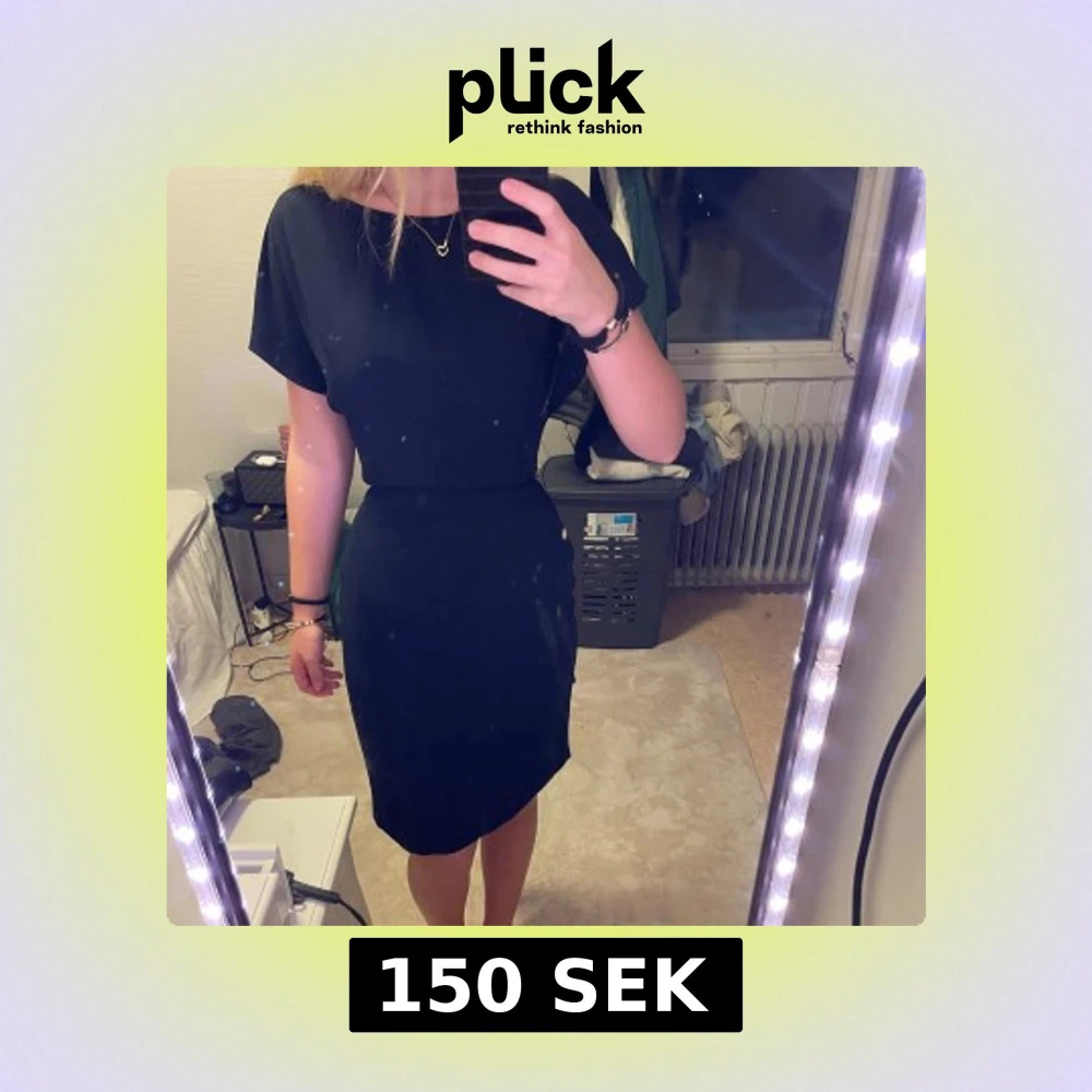 Snygg svart/mörkblå klänning med knytband i midjan och korta ärmar. Perfekt för en stilren look. Klänningen har en slits baktill för extra rörelsefrihet.