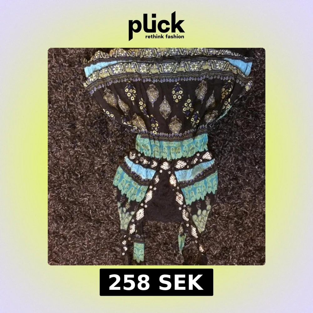 Säljer en svart klänning med turkosa och gula detaljer samt vackert mönster. Klänningen har knytband vid axlarna och ett bohemiskt, färgstarkt utseende. Perfekt för dig som gillar unika plagg med mycket mönster och färg.
