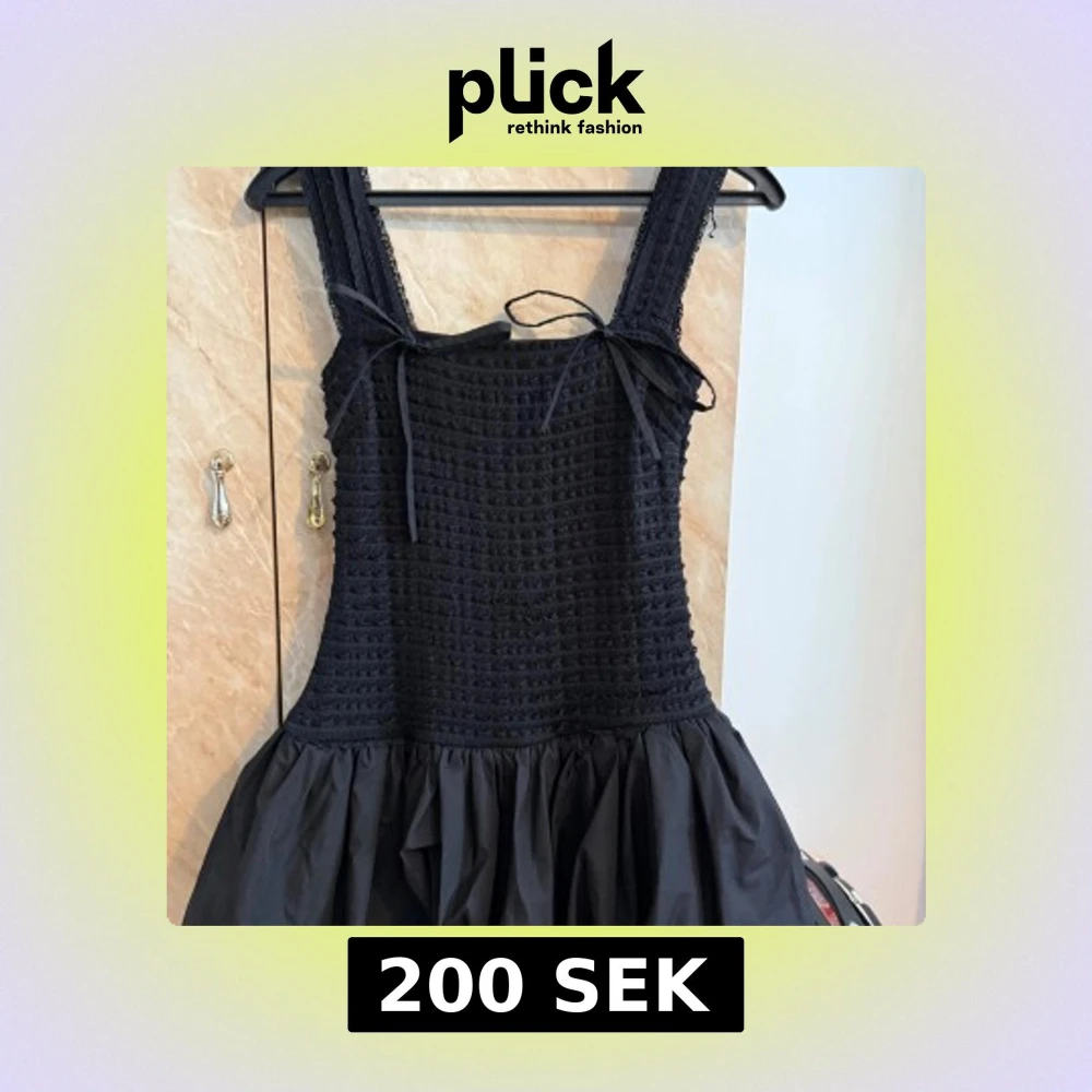 Supersöt svart klänning med smockad överdel, breda axelband och knytband framtill. Kjolen är voluminös och har volang. Perfekt för dig som gillar en lekfull och trendig stil. Klänningen är bara använt en gång, därför är den i bra(ny)skick!
