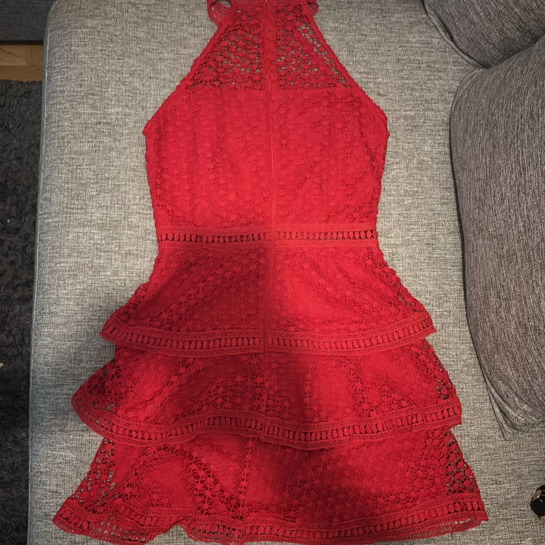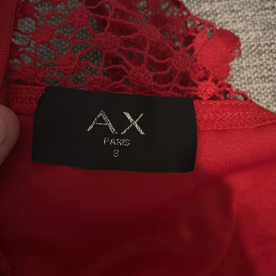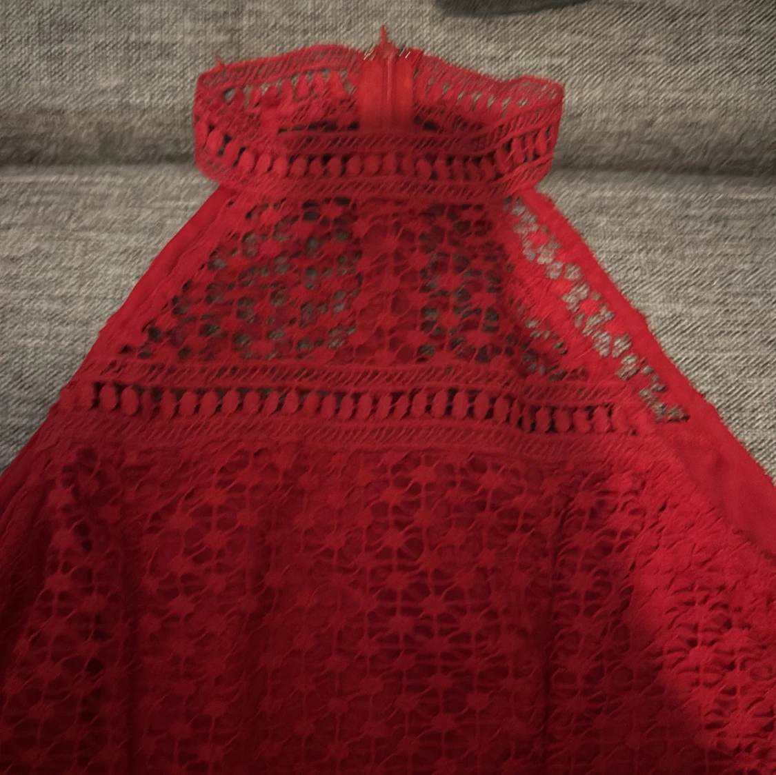 Världens snyggaste klänning, helt unik. Finaste röda färgen( ej julröd) Supersnygg röd kortklänning från AX Paris med hög hals och vackra spetsdetaljer. Klänningen har volangiga lager och är ärmlös med en figurnära passform. Perfekt för dig som vill sticka ut med en färgstark look.storlek 8 är xxs