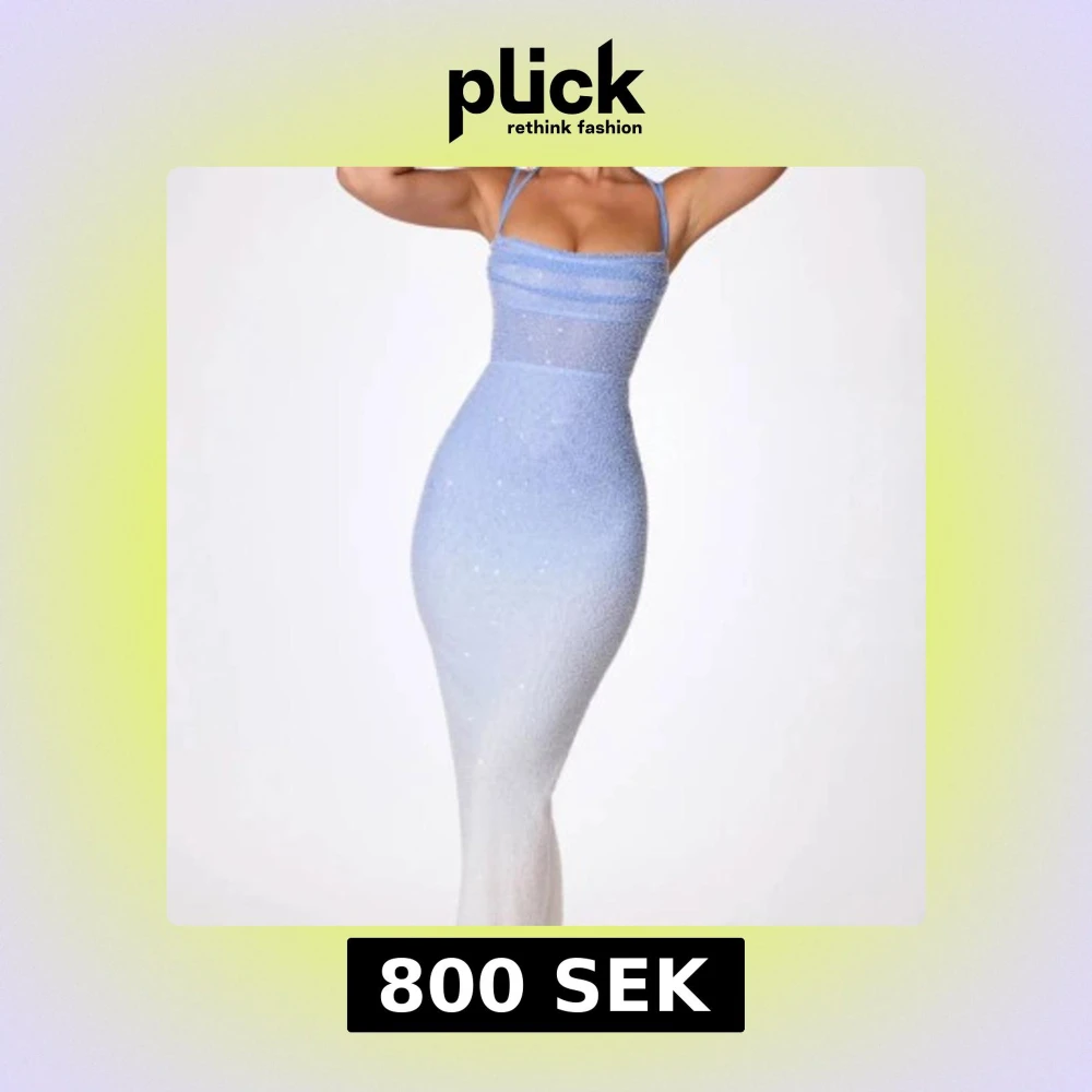 Supersnygg långklänning i blått och vitt med glittriga detaljer. Klänningen har smala axelband, figurnära passform och öppen rygg. (Slutsåld online). 🤍