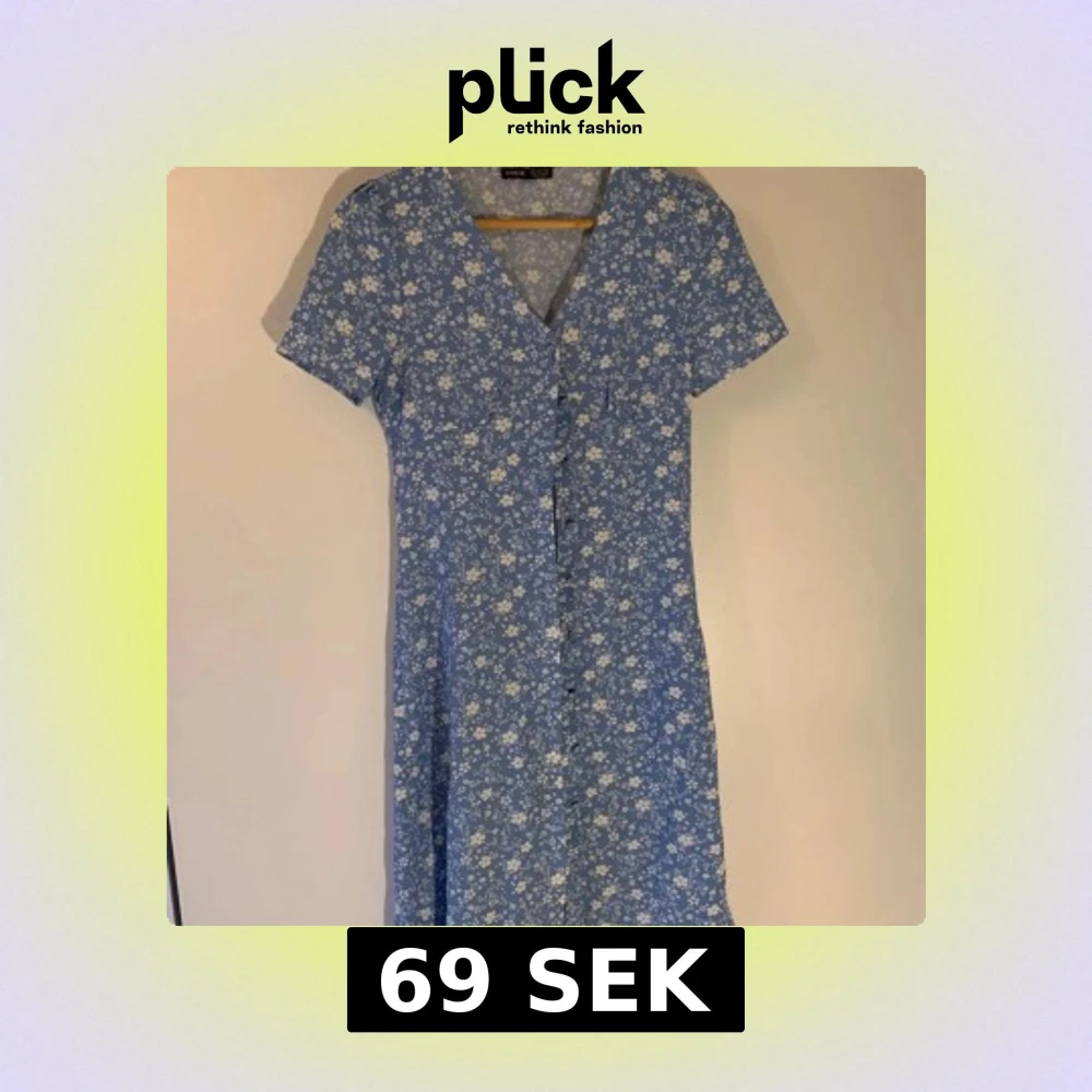 Charmig blå klänning med ett sött blommönster i vitt. Klänningen har korta ärmar och en v-ringad halslinje, perfekt för en somrig look. Den är knälång och har en avslappnad passform som ger en bekväm känsla. Perfekt för varma dagar!