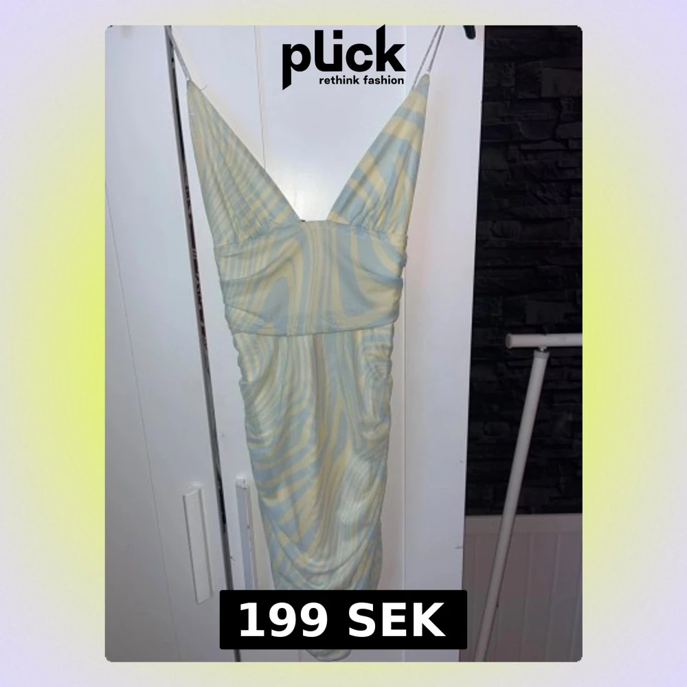 Kläning med tunna axelband och draperad effekt. Klänningen har ett vågigt mönster i ljusblått och ljusgul, samt en figurnära passform.