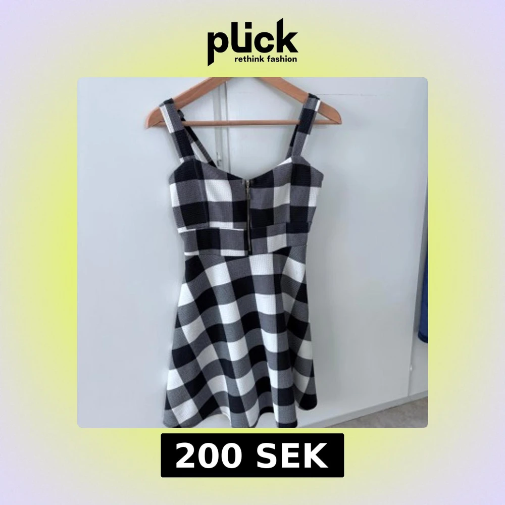 Säljer en svartvit rutig klänning med breda axelband och dragkedja framtill. Klänningen har en utställd kjol och är ärmlös, perfekt för en trendig look. Materialet känns stabilt och mönstret är klassiskt rutigt.