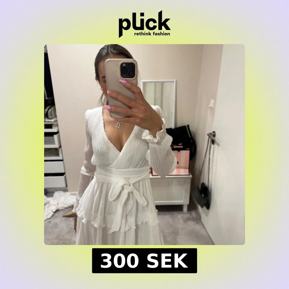 Säljer en superfin vit omlottklänning med långa ärmar och volangdetaljer. Klänningen har ett knytband i midjan och v-ringad hals. Perfekt för sommarens tillfällen och studentfirande! Från Dennis maglic
