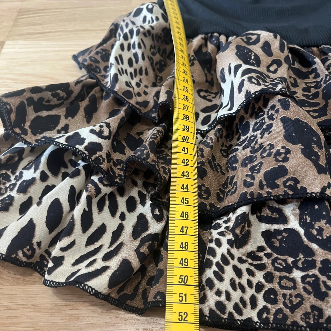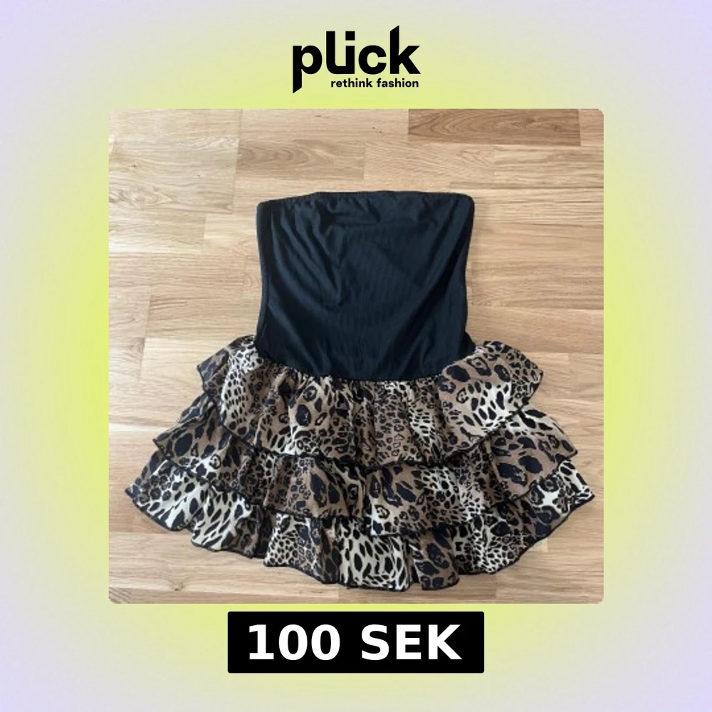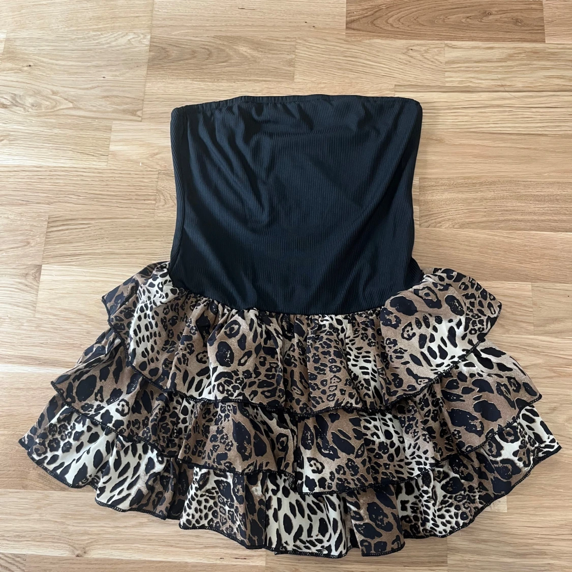 Superfin kort och axelbandslös klänning från SHEIN i storlek Petite S. Svart stretching överdel och volangkjol i leopardmönster. 📩 Skicka gärna ett meddelande vid frågor eller om du vill ha flera bilder! 🌸😊 📦 Jag skickar snabbt och packar alltid med omsorg!