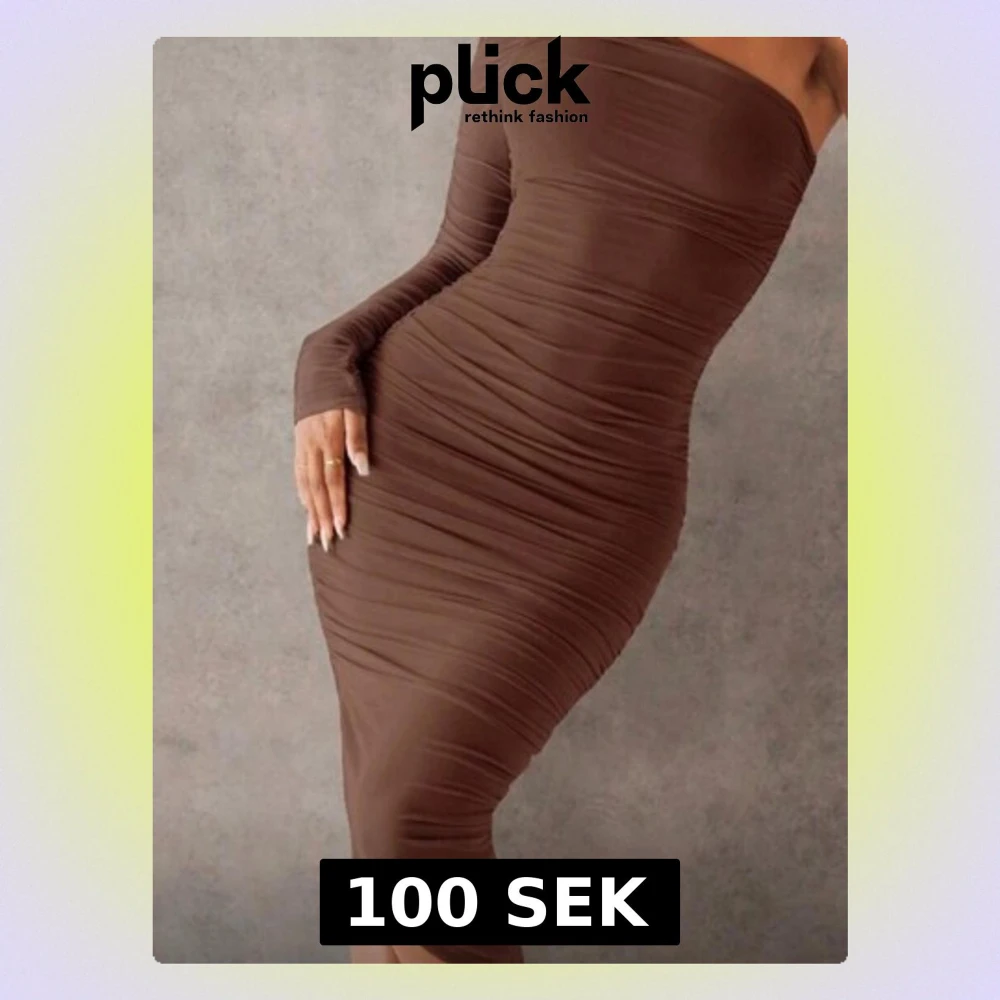 Snygg brun figurnära klänning med one shoulder-design och lång ärm på ena sidan. Klänningen har rynkade detaljer längs hela kroppen och är tillverkad i ett stretchigt material som framhäver siluetten. Perfekt för dig som vill sticka ut med en modern och trendig look.