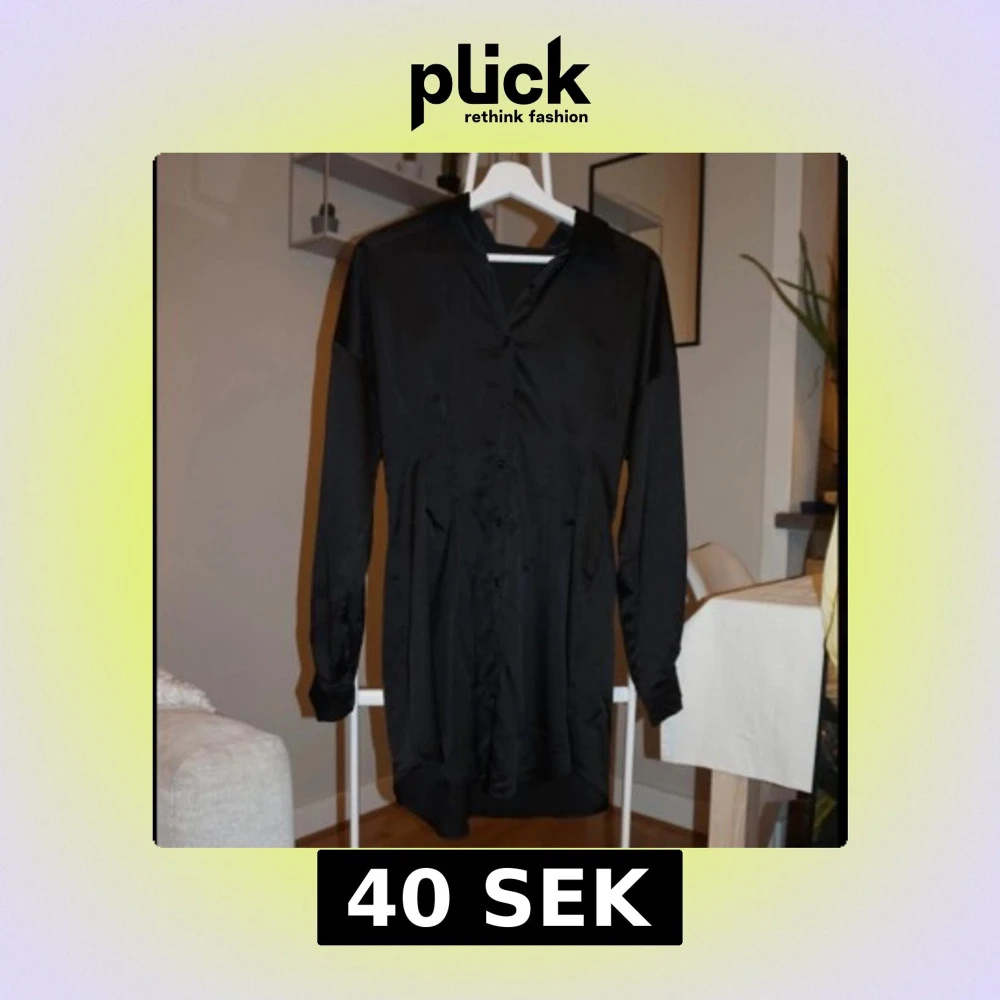 Stilren svart skjortklänning med lång ärm och knappar framtill. Klänningen har en lätt glansig satinlook och markerad midja för en snygg siluett. Perfekt för dig som gillar minimalistisk och elegant stil.