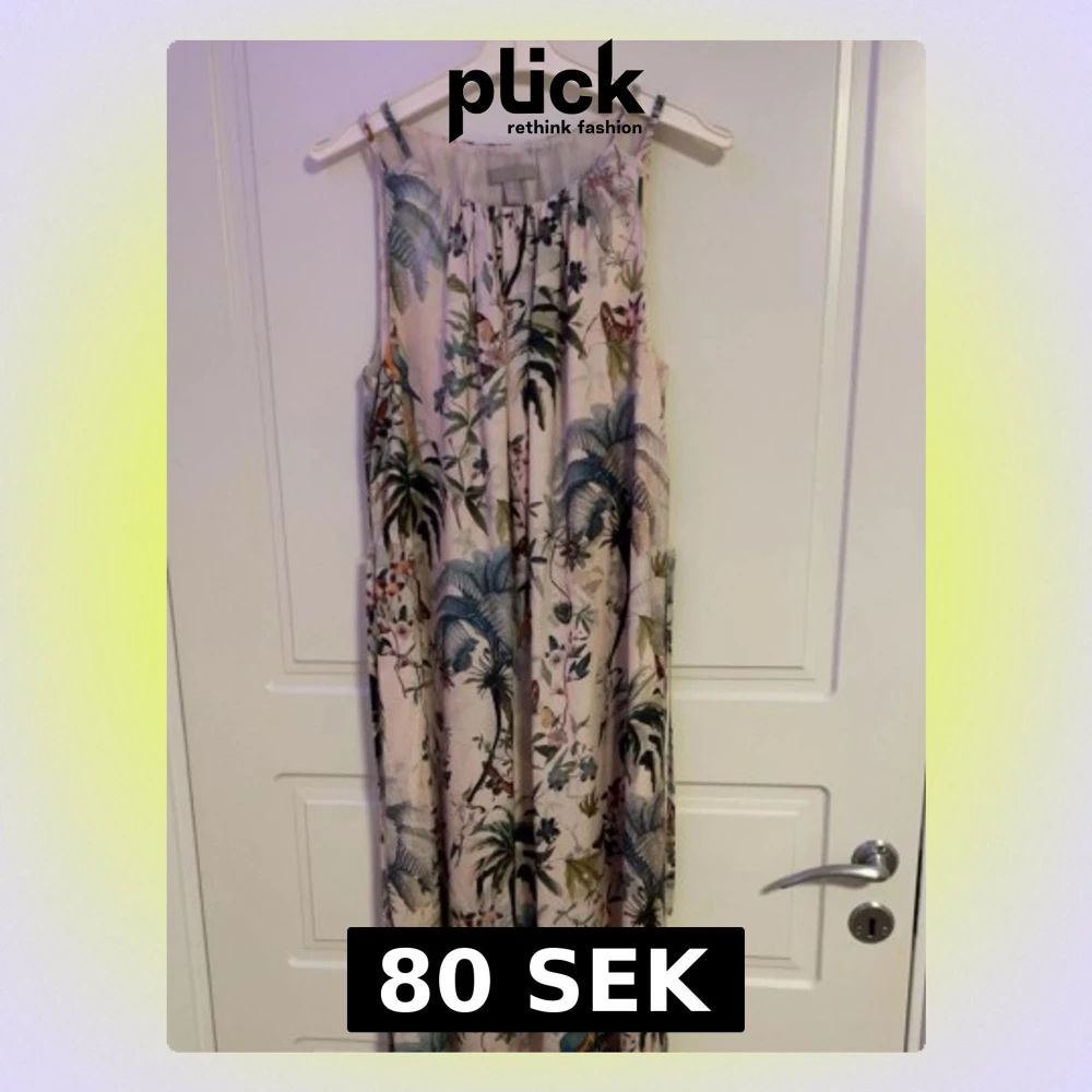 Säljer en ärmlös långklänning med tropiskt blommigt mönster i grönt, blått och beige. Klänningen har rund halsringning och ett luftigt, flowy fall. Perfekt för sommardagar och semester. Materialet känns lätt och svalt, troligen polyester eller bomull.