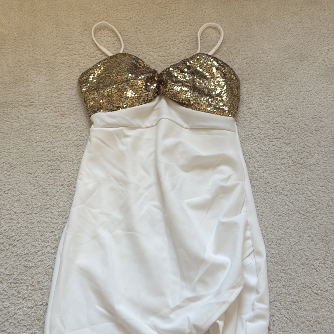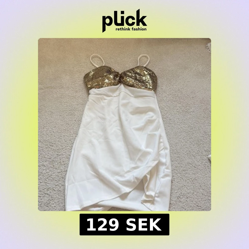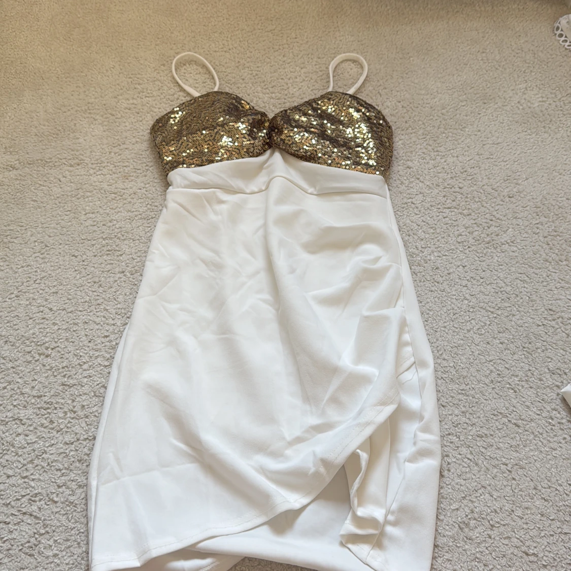 Supersnygg vit kortklänning med smala axelband och glittrig överdel i guldpaljetter. Kjolen har omlott-design och slits framtill för extra vibe. Perfekt för dig som vill sticka ut med en glam look. Materialet känns mjukt och följsamt mot huden.