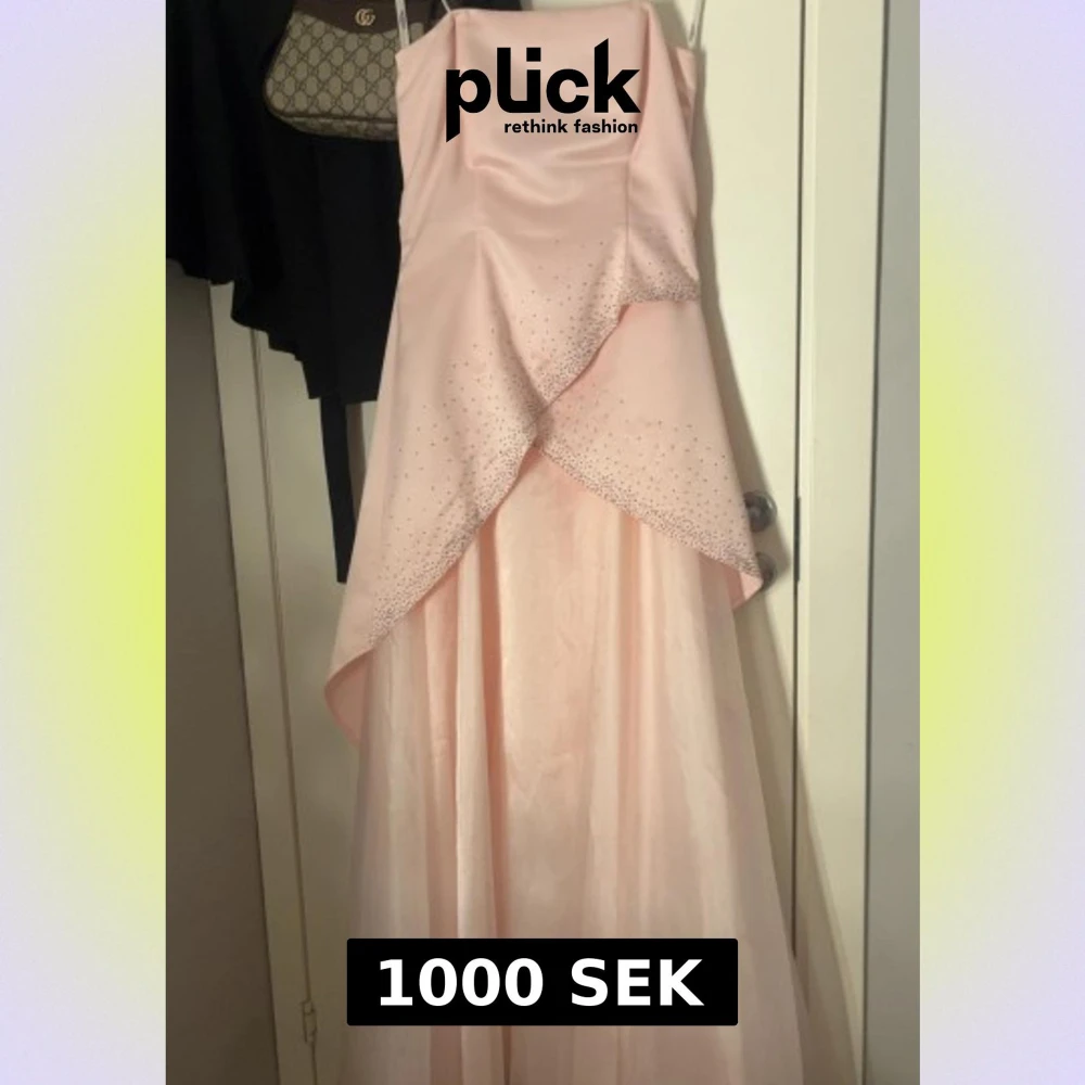Superfin ljusrosa långklänning med tunna axelband och glittriga strassdetaljer på överdelen. Klänningen har omlottliknande lager framtill och är gjord i ett glansigt, satinliknande material. Dragkedja i ryggen för enkel påklädning. Perfekt för bal eller student. Använd vid två tillfällen