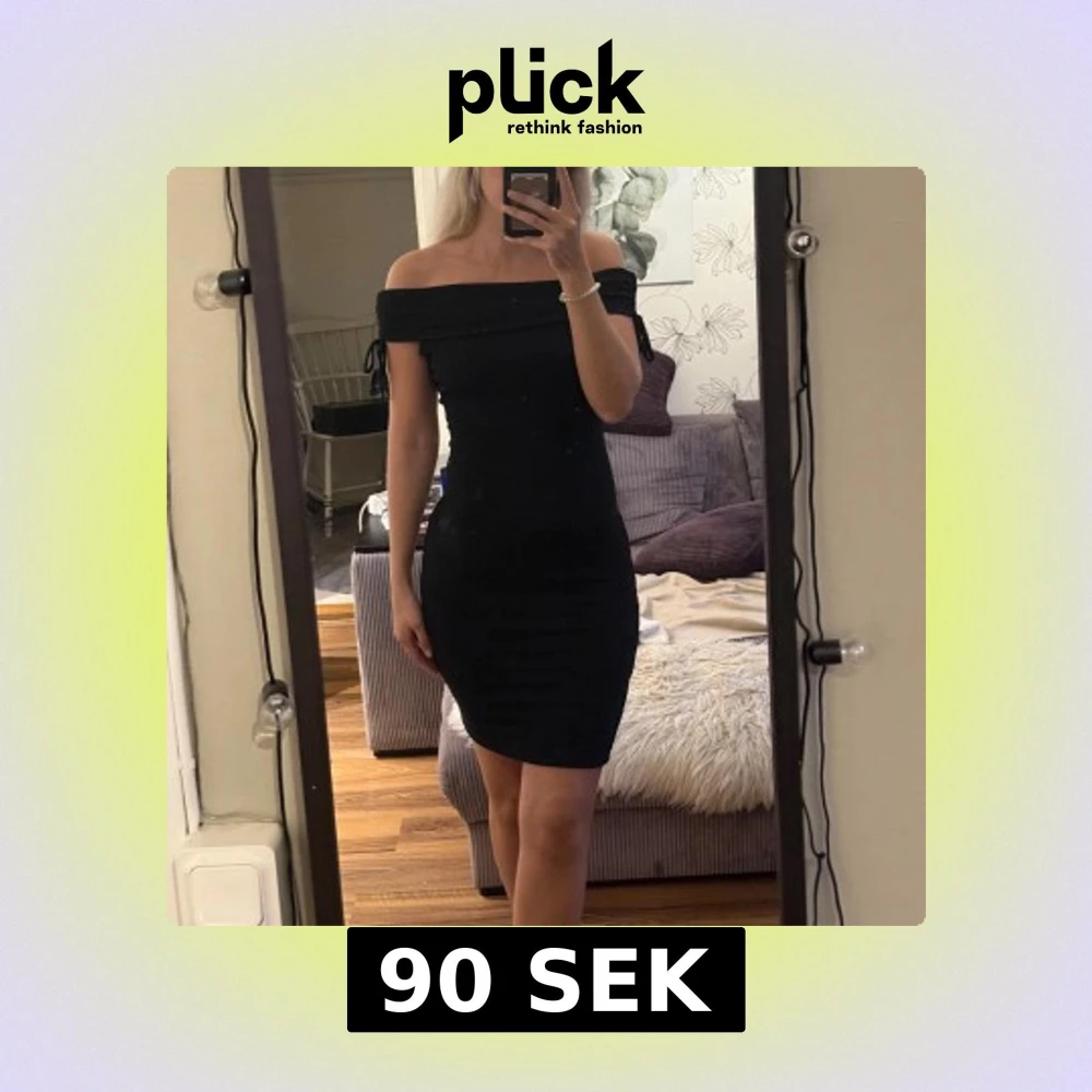 Snygg svart offshoulder klänning med tight passform och kort längd. Klänningen har knytband vid axlarna och är tillverkad i ett lätt rynkat material som ger en cool struktur. Perfekt för dig som gillar en stilren och trendig look