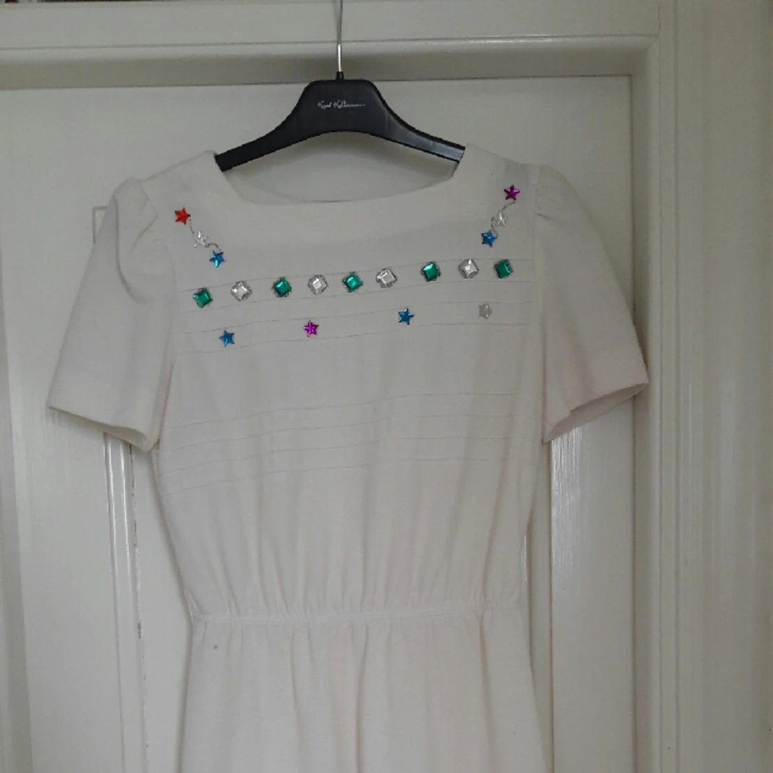 Bli ägare till denna helt unika klänning! Vacker vintageklänning i krämig vit polyester. Dragkedja i ryggen och resår i midjan ger en jättefin passform! Spännande detaljer i form av knappar på ena axeln och färgglada glitterapplikationer över bysten. Mindre fläck nere vid midjan (se bild), i övrigt utmärkt skick.