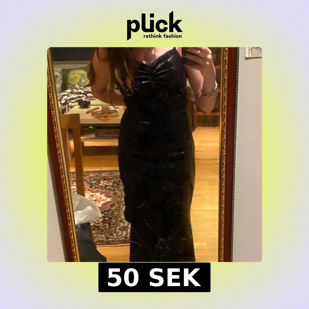 Svart lång mönstrad klänning i något sammets liknande material(syntetiskt) men väldigt stretchigt, den har även volanger nertill. Fick av en vän för väldigt länge sedan och har aldrig använt den, kan vara från Shein men vet inte så säljer den billigt. Den är alldeles för stor för mig så jag håller den i midjan i första bilden för att visa hur den hade sett ut på. Jättebra skick och som sagt knappt använd!