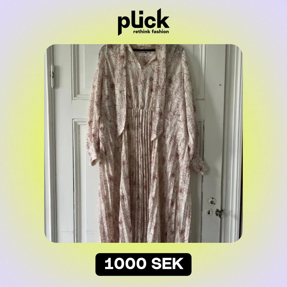 St står inte men det är en S Jättevacker sommarklänning i ngt sidenaktigt tyg. Vackert drapperad i ryggen. Andvänd en gång på bröllop. Väldigt fint skick.