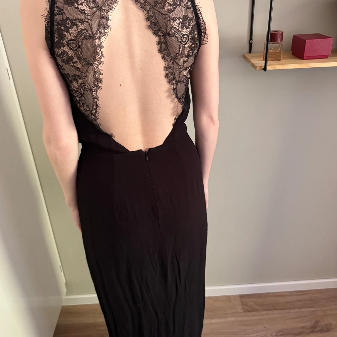 Säljer en svart långklänning med smala axelband och vacker spetsdetalj i ryggen som ger en öppen rygg-effekt. Klänningen har en elegant och figurnära passform, perfekt för festliga tillfällen.
