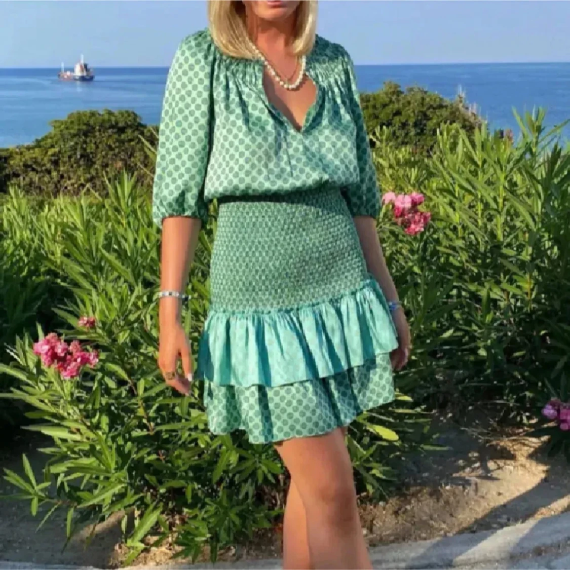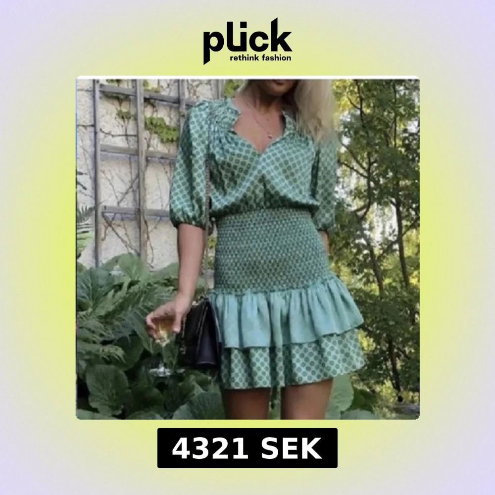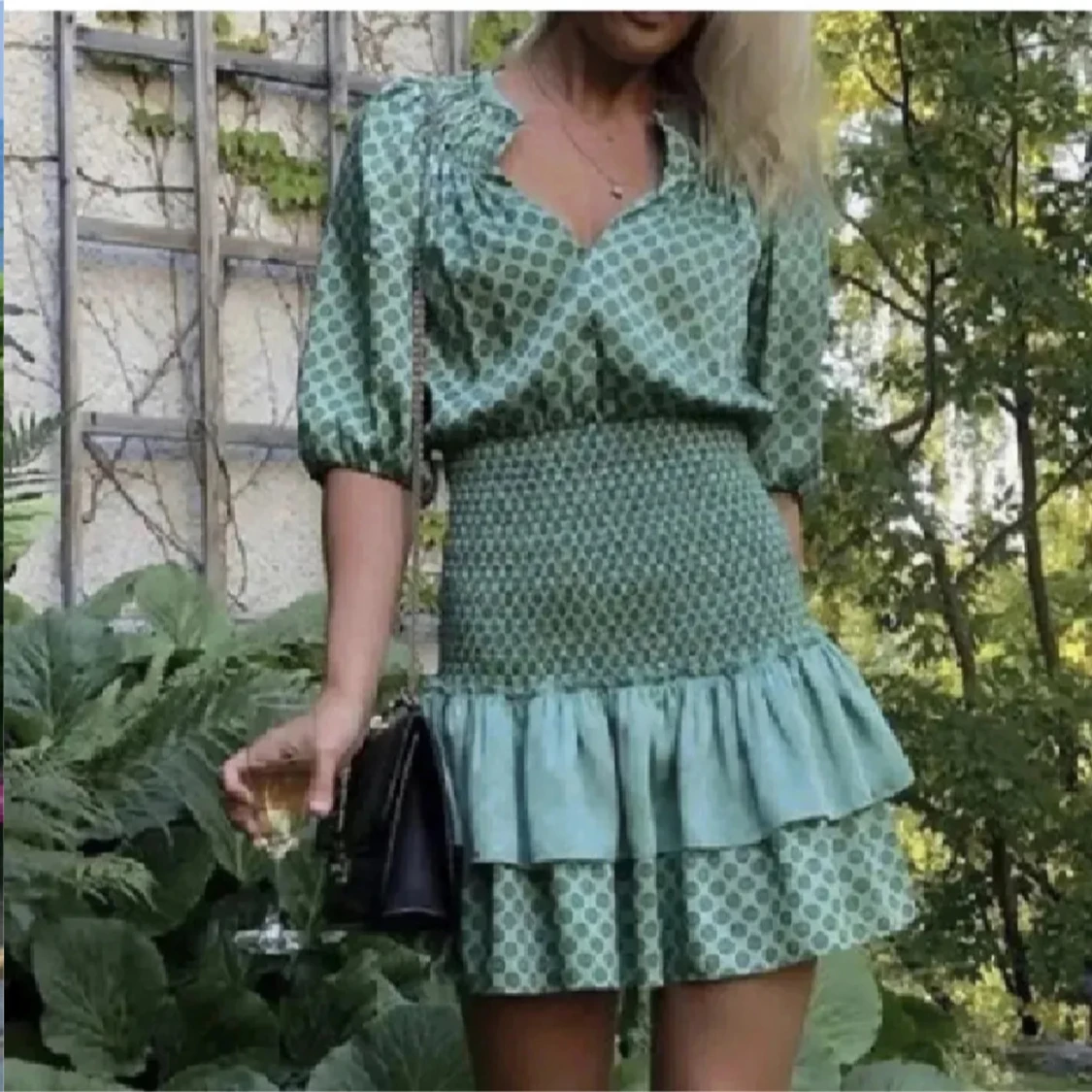 INTRESEKOLL Supersöt grön kortklänning med prickigt mönster, v-ringning och trekvartsärm. Smockad midja och dubbla volanger nertill ger en riktigt snygg siluett. Perfekt för varma dagar och somriga vibes!