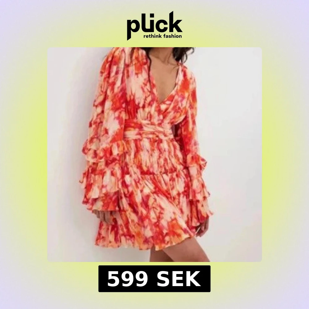 Säljer en superfin kortklänning från Sanna Jörnviks kollektion med NA-KD i storlek 32. Klänningen har ett färgstarkt mönster i rött, orange och rosa, v-ringning, volangdetaljer och långa ärmar. Perfekt för dig som vill ha den perfekta sommarklänningen.