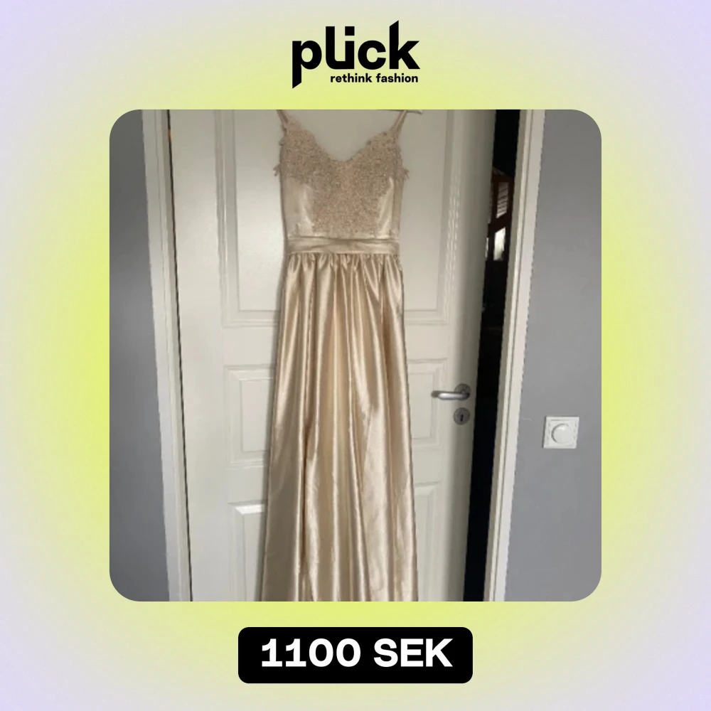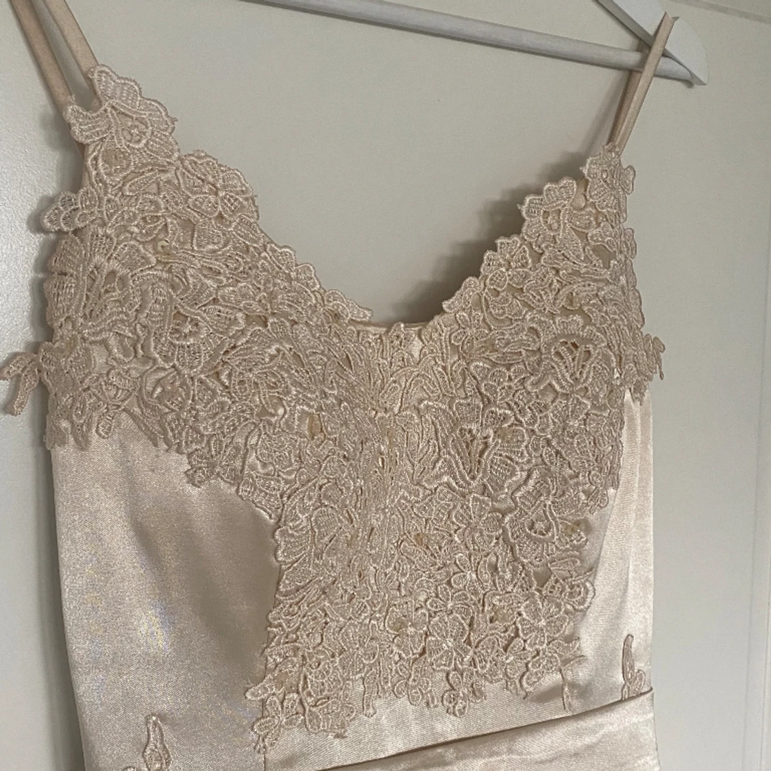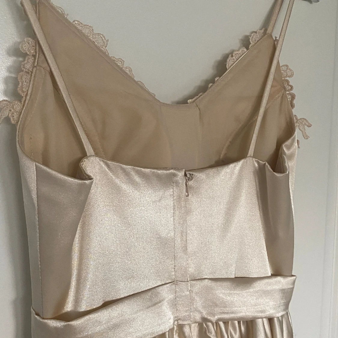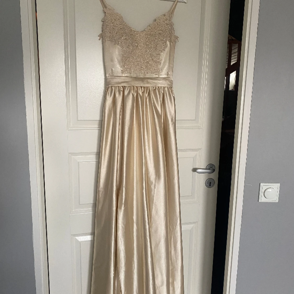 Champagnefärgad balklänning i satin. Köpte den av en tjej som använt den två gånger tidigare, jättefint skick! Står ingen strolek men passar en s.
